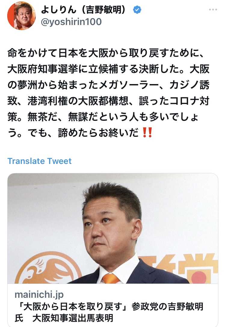 昨日参政党アドバイザー、医師の吉野俊明さんが参政党から大阪府知事選挙に立候補をされました。