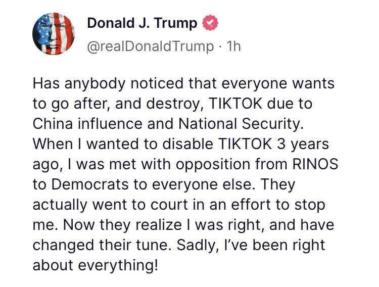 3年前に私がTIKTOKを無効にしようとした時にはRINOや民主党や皆の反対にあった。彼らは実際に私を止めさせようと裁判を起こそうとした。今、彼らは私が正しかったことがわかったらしい、コロッと態度を変えて来た。悲しいかな、全てにおいて私が正しかった!