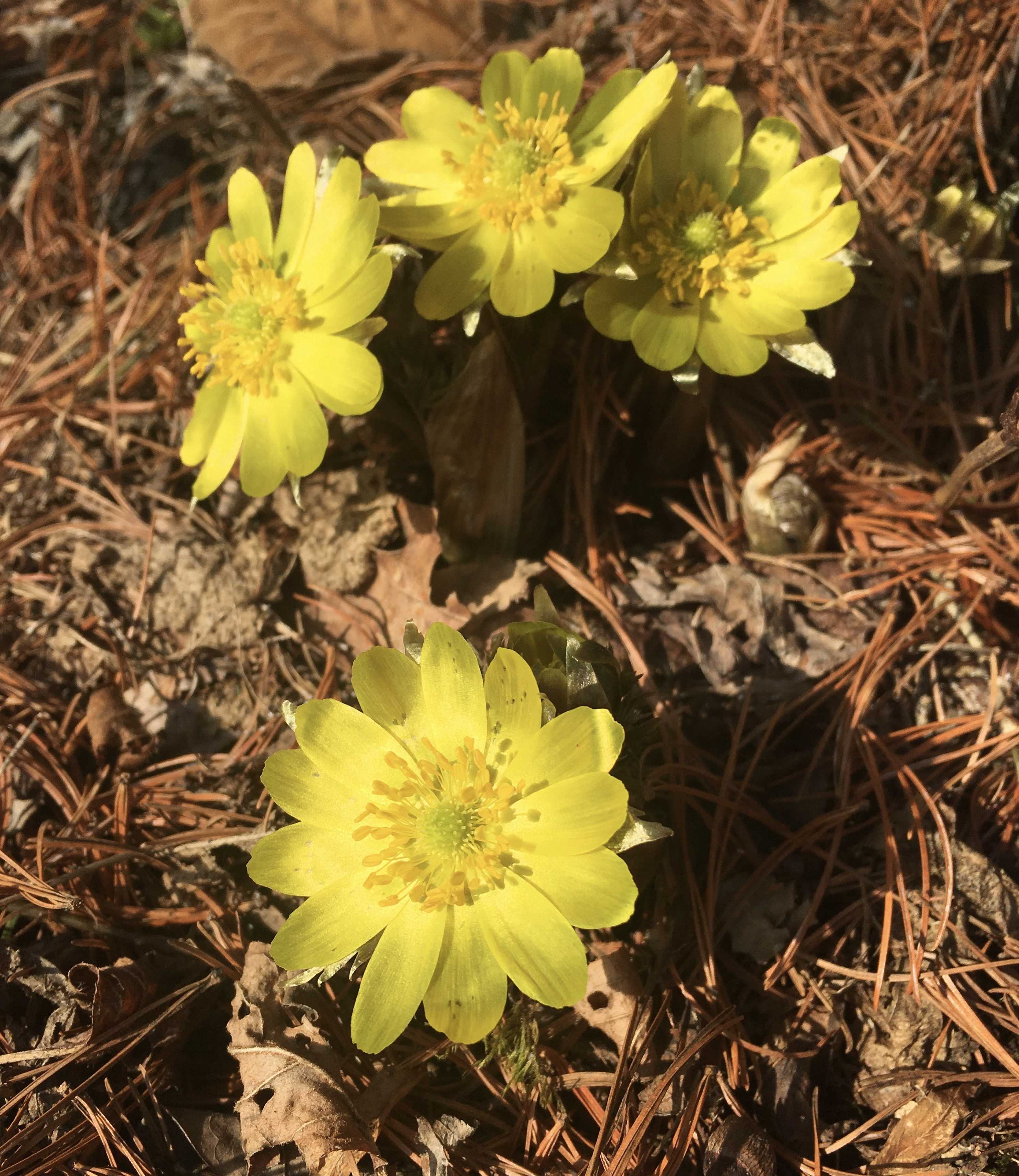 今朝お散歩中に見つけた福寿草です。朝日を受けて花びらが開きます。春の花はお日さま色をしていますね。😊