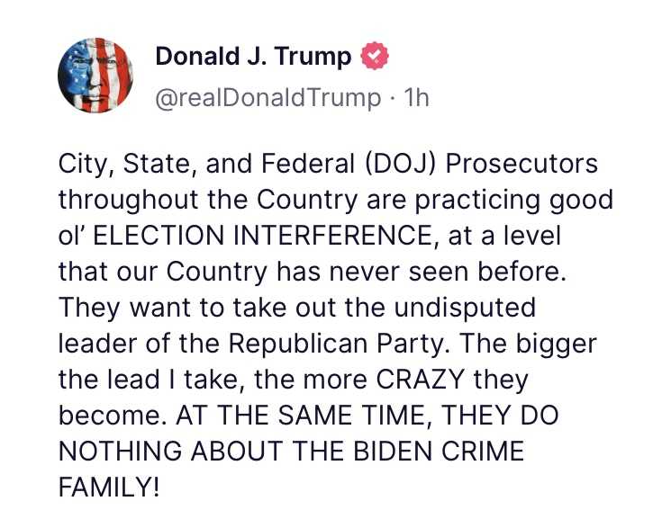 アメリカ中の市や州、そして連邦裁判所の検察官たち皆、今まで経験したことがないレベルの選挙妨害行為を行っている。彼らは共和党の誰もが認めるリーダーを取り除きたいのだ。私の指示が大きくリードすればするほど、彼らはよりクレージーになる。その上、彼らはバイデン犯罪一家については何もしない!