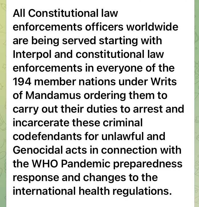 世界中の憲法執行官たちが、194の国々の国際刑事警察機構と共に、WHOのパンデミック対策のための対応と世界的な健康規則の変更に関係して違法なジェノサイド行動を起こした共犯者を逮捕、監禁できる権限のある職務執行令状の元で仕事をしている。
