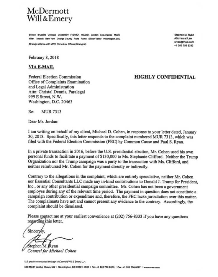 全体が推論に過ぎない不服申し立てに反することとして、コーエン氏もEssential Consultants LLCも、Donald J. Tramp for President、或いは大統領選キャンペーンへの寄付はしていません。その期間、コーエン氏が政府のために働いていたことはありません。議論されている支払いは、選挙キャンペーンへの寄付や経費ではありません。それ故この件に関しては、FECが管轄権を有していません。それどころか申立人は証拠を提示できないばかりか、提示したこともありません。