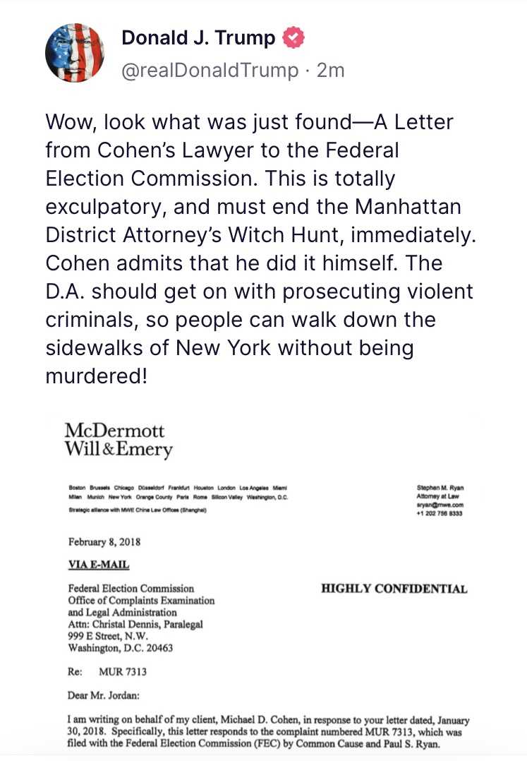 Wow、今見つけたものを見てくれ ー コーエンの弁護士が政府の選挙管理委員会へ送った手紙だ。これは完全に(私の)無罪を意味するもの、だから直ちにマンハッタン地方検事は魔女狩りをやめるべきだ。コーエンはすぐに自分が仕組んだことを白状するだろう。D.A.は重罪人を起訴することに取り掛かるべきだ。それで、人々は殺害されることなく、通りを安心して歩けるようになる!