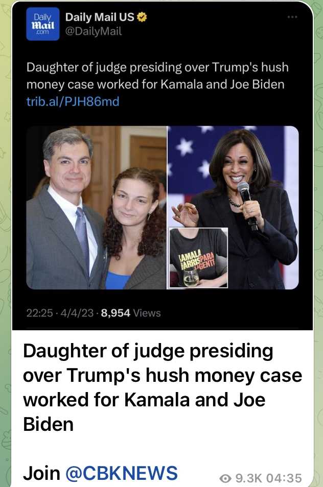 トランプの口止め料ケースを担当する裁判長の娘がカマラ ハリスとジョー バイデンのために仕事をして来た。
