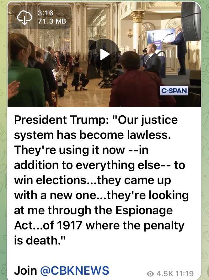 ”我々の司法制度は無法になってしまった。彼らはそのことをあらゆることに利用して、選挙に勝とうとしているし、彼らが新たに利用しようといるのは、Espionage Act...1917、刑罰は死刑だ。”