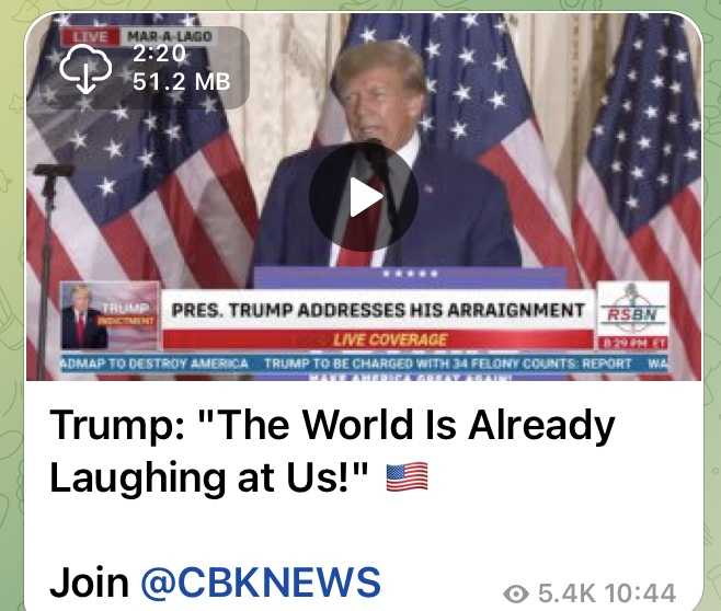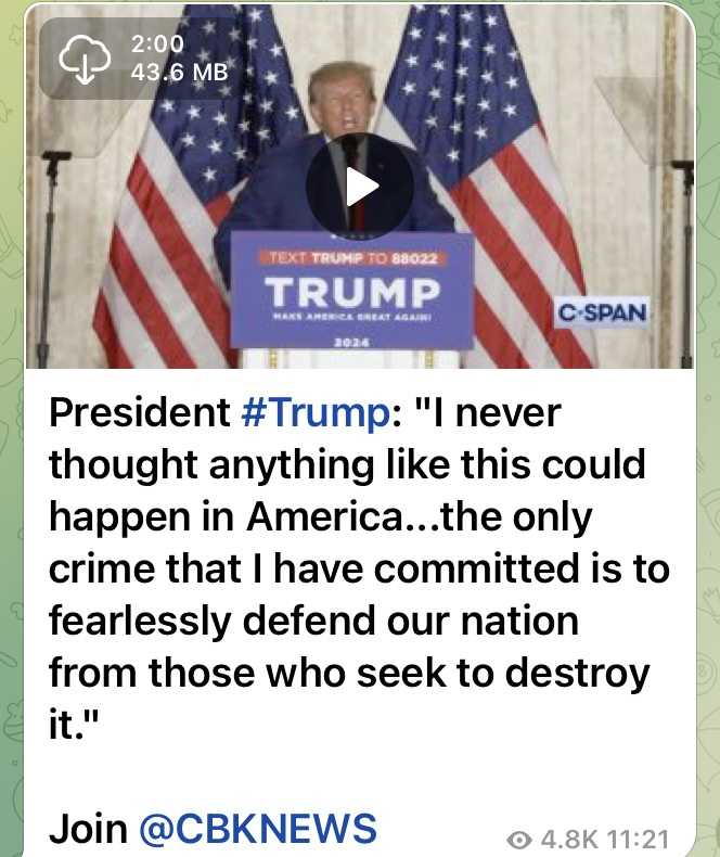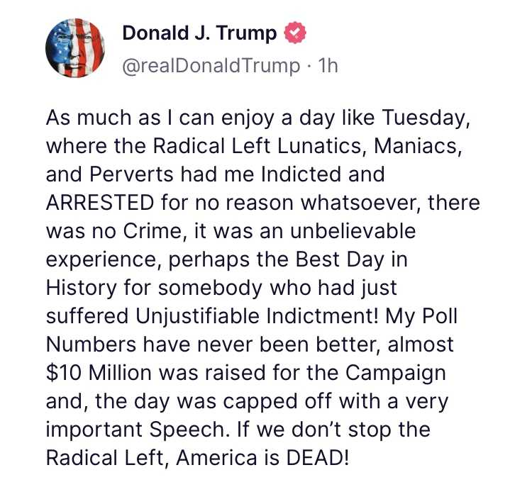 火曜日の出来事の一日を私は楽しんでいるが、一方で過激な左派の狂人たち、 マニアックたち、 変態たちは私を理由もなく起訴し、犯罪を犯していないにも関わらず逮捕させた。それは信じがたい経験だったが、恐らく不当な起訴に苦しんでいた人間にとって歴史上最良の一日になった! 私の世論調査の数字も上がり、$10Million(一千万ドル)もキャンペーンに集まったからだ。その日はとても重要なスピーチで幕を閉じた。もし我々が過激な左派を止めなければ、アメリカは死んでしまう!