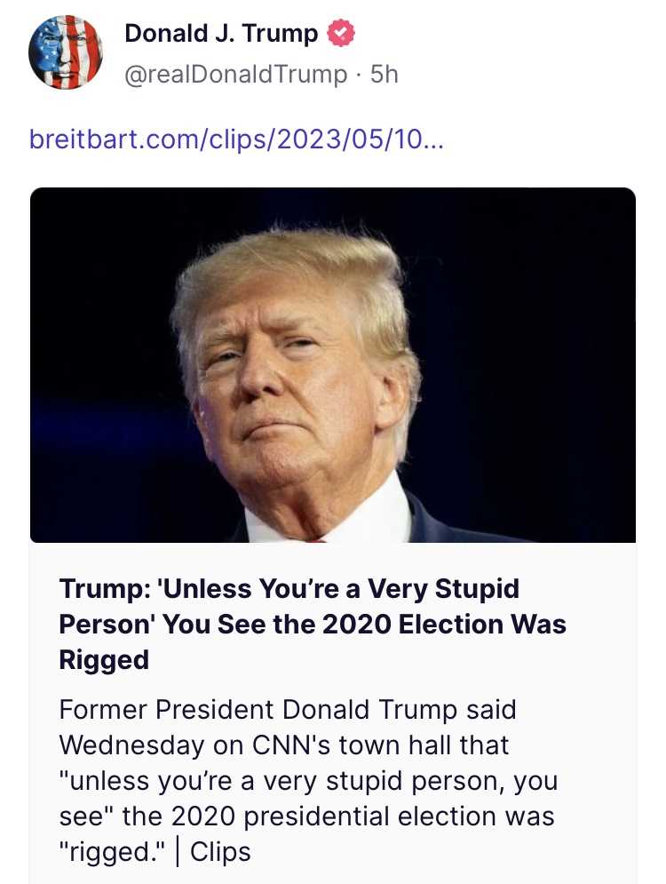 元大統領、ドナルド トランプは水曜日、CNNのタウンホールで、”あなたが愚かな人間でなければ、2020年の大統領選挙は盗まれたことがわかるはずだ。”