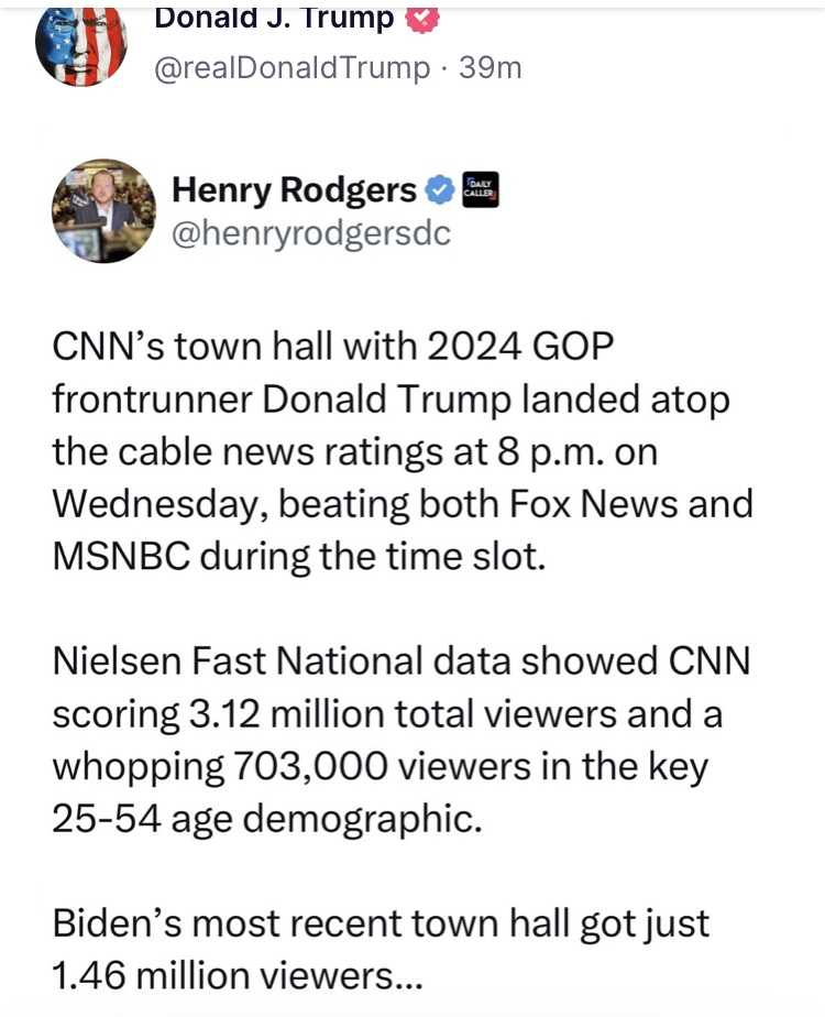 大統領選の最有力候補者のドナルド トランプが出演したCNNのタウンホールライブは、水曜日の夜8時にケーブルニュース視聴率第一位を記録した。その時間帯はFOX NewsやMSNBCを抜いた。