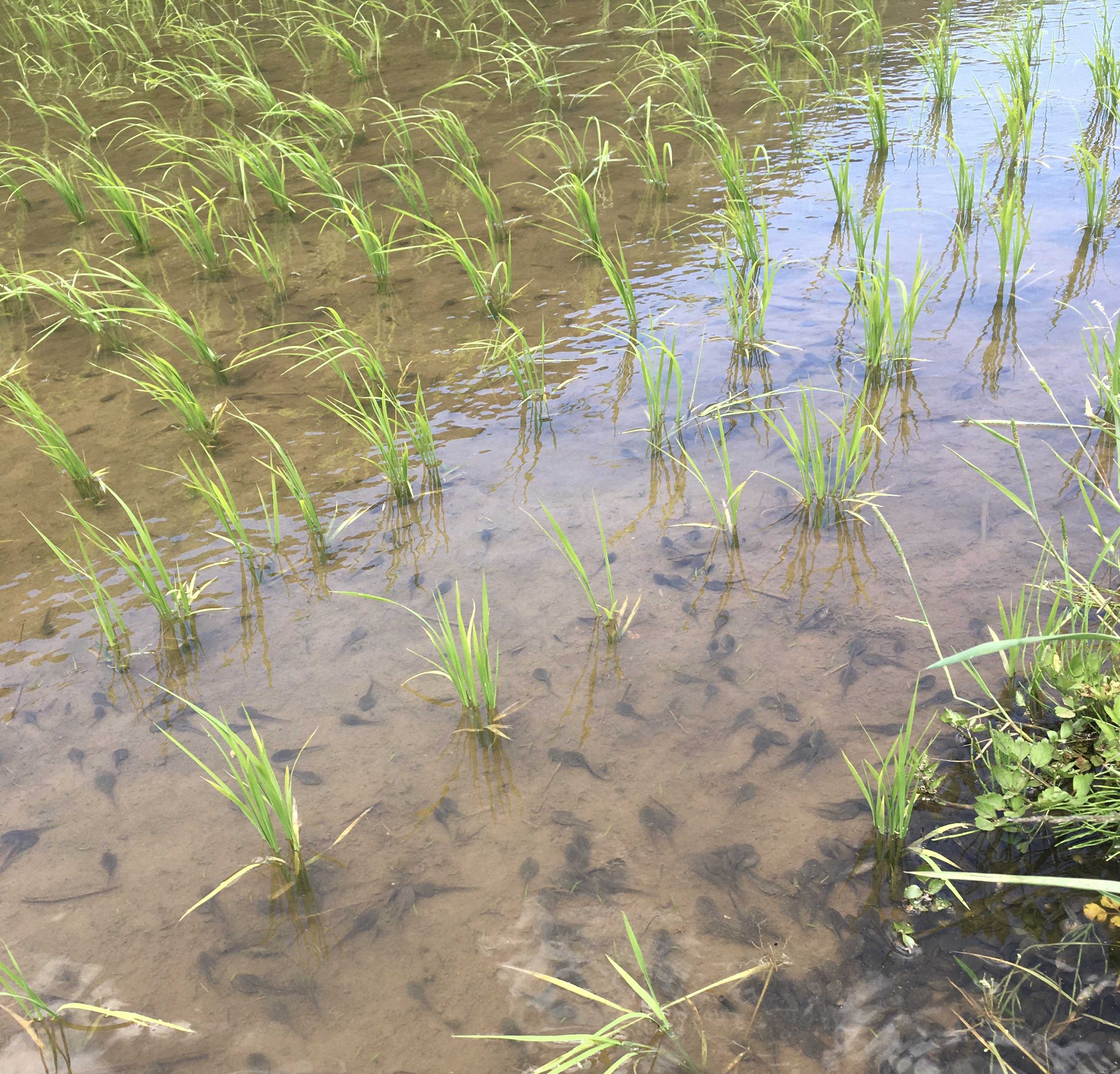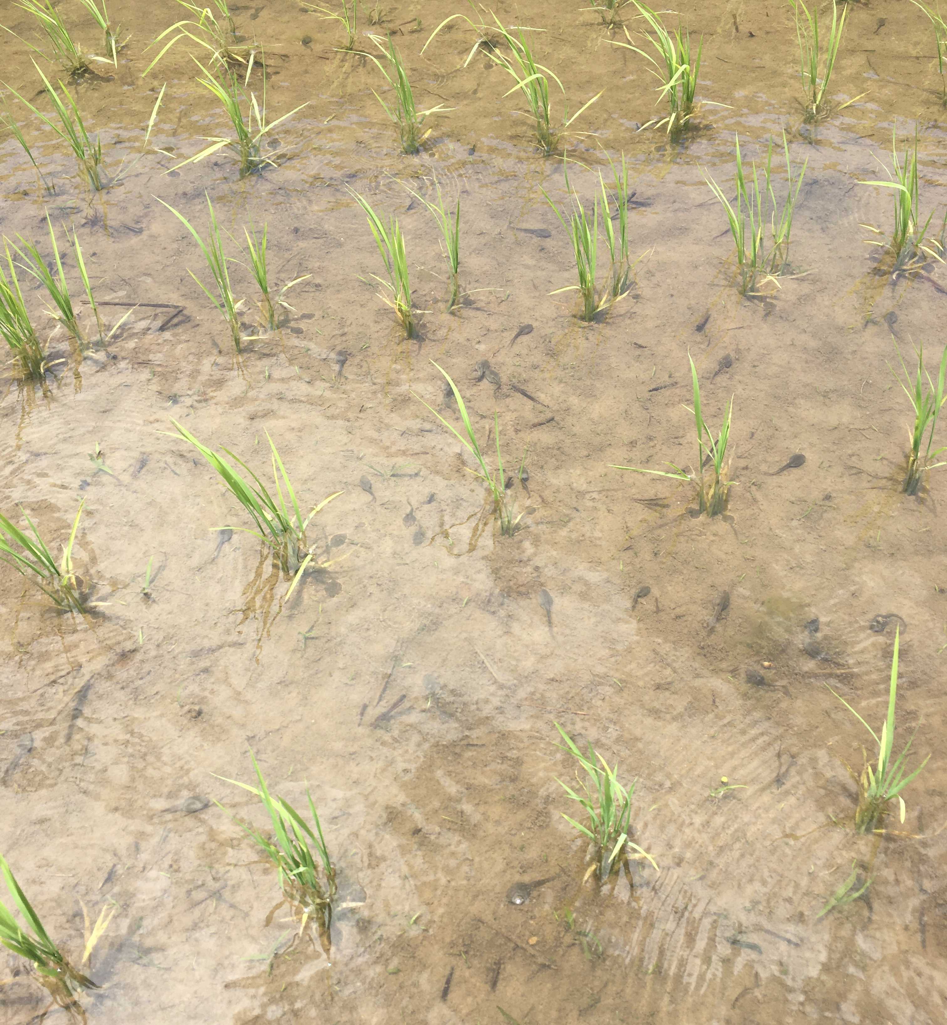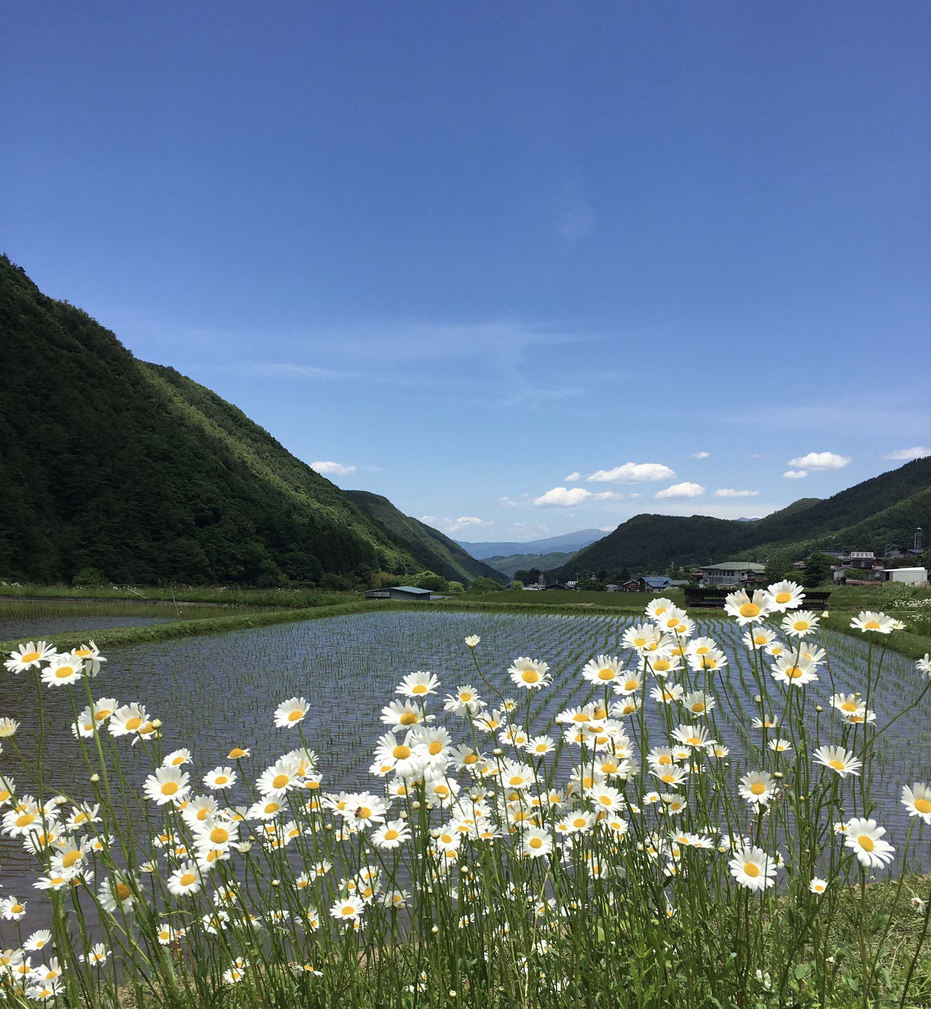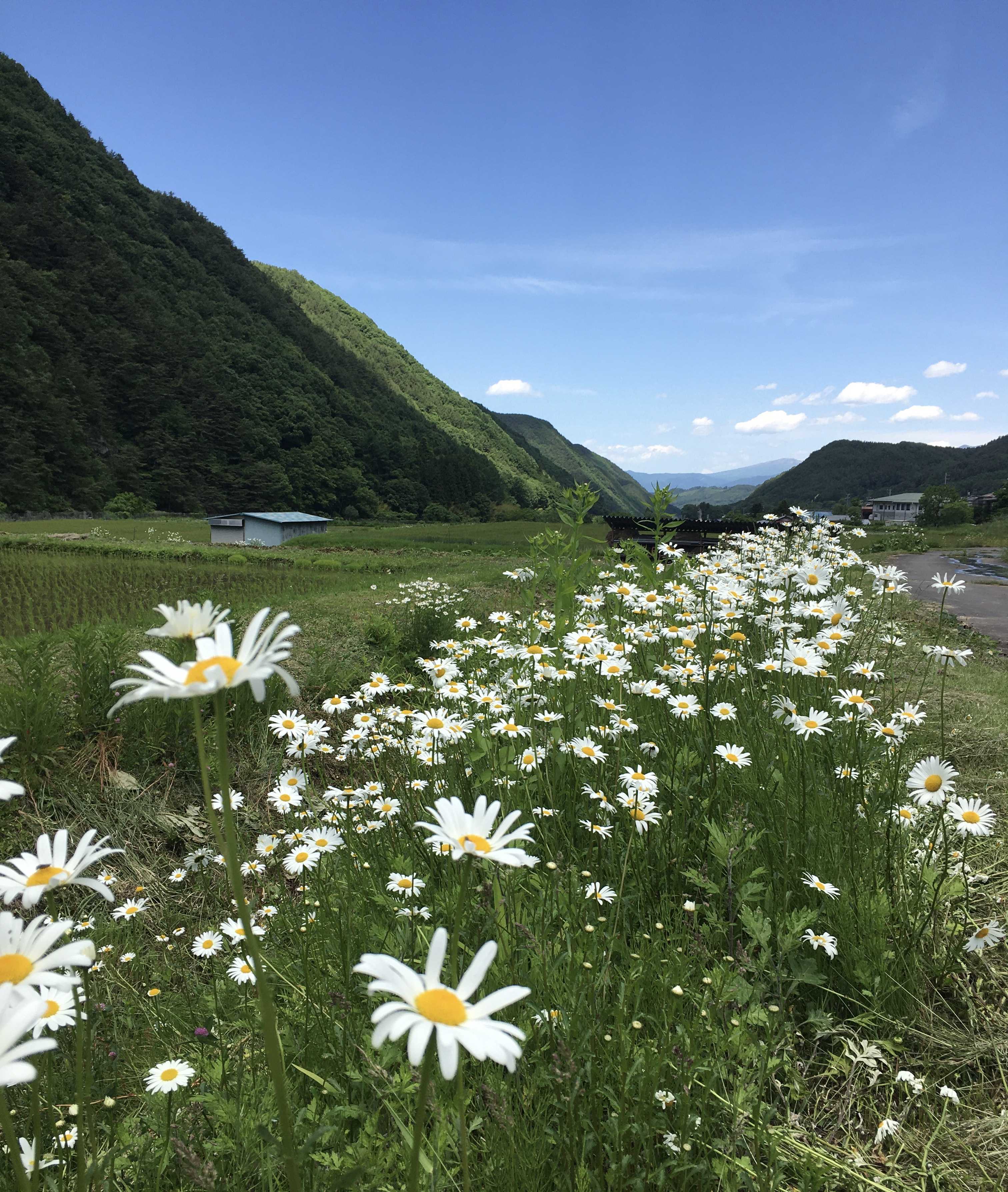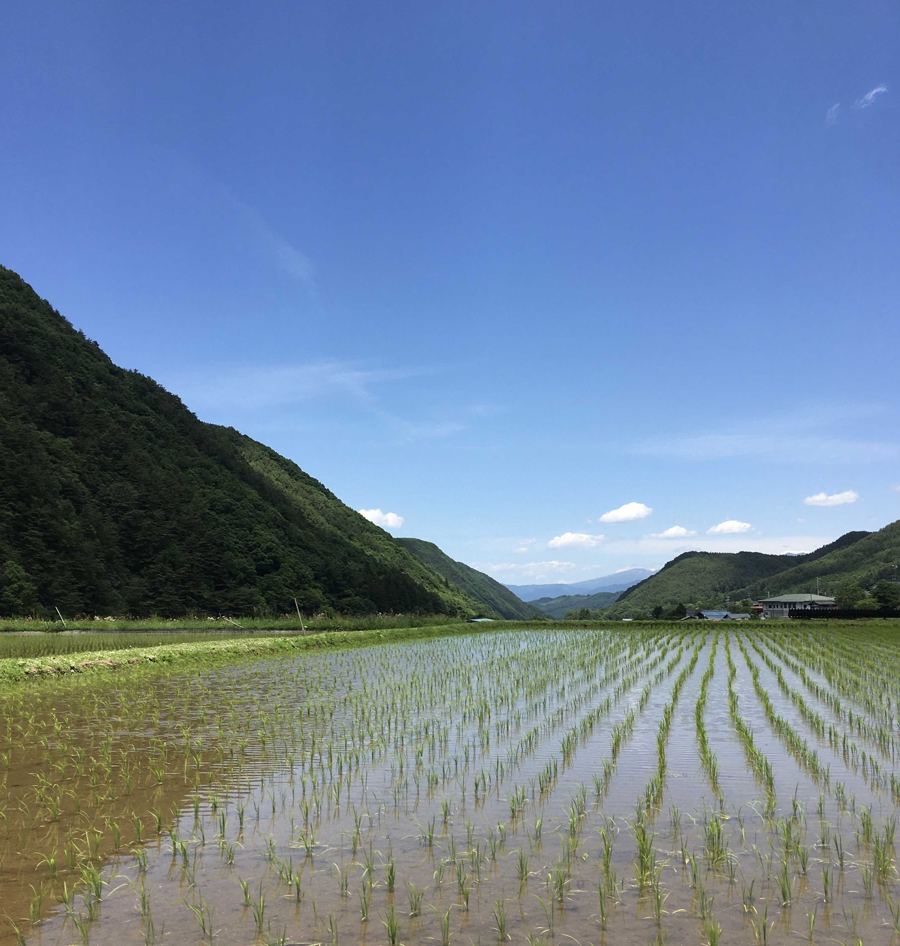 畑をお借りしている場所の周りは田植えを終えた水田が広がっています。山間に作られた緩い段々畑は下の町へと少しづつ下がっています。山から自然に流れ出る小川が水路となり田畑を潤しているのです。