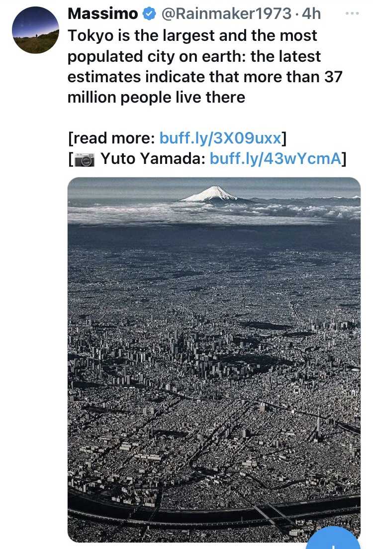 東京は地球上で最も大きく人口が多い都市:最近の統計では37ミリオン(3,700万人)がそこに住んでいる。