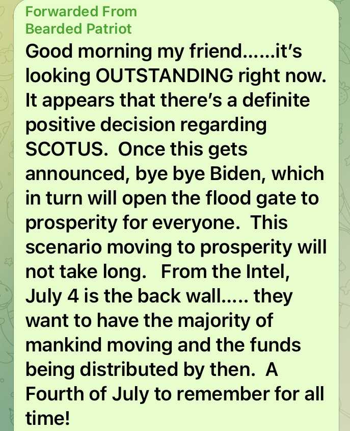 おはよう、友よ......今、素晴らしい状況だ。 どうやらSCOTUS(連邦準備制度理事会)に関して前向きな決定が下されるようだ。 これが発表されれば、バイデンに別れを告げ、すべての人に繁栄の門が開かれることになる。 この繁栄へのシナリオはそう長くはかからないだろう。 インテルからすれば、7月4日は背後の壁だ......彼らはそれまでに人類の大半を動かし、資金を分配させたいのだ。 永遠に忘れられない7月4日!