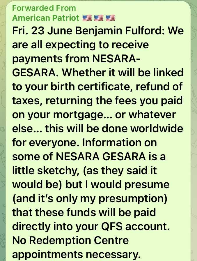 それが出生証明書に関連したものであろうと、税金の還付であろうと、住宅ローンで支払った手数料の返還であろうと......あるいは他の何であろうと......これはすべての人のために世界中で行われるでしょう。NESARA GESARAの一部に関する情報は、(彼らが言ったように)少し大雑把ですが、これらの資金はQFS口座に直接振り込まれると推測されます(あくまでも私の推測ですが)。換金センターの予約は必要ありません。