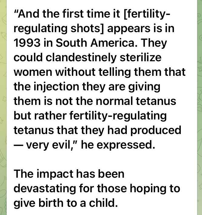 ”生殖能力規制のための注射が最初に使われたのは1993年南アメリカだった。彼らは女性たちに、その注射が破傷風を防ぐ注射だと偽り、実は彼らが作った妊娠を規制するための破傷風注射を打ったのだ ー 非常に悪質だった " と彼が説明した。