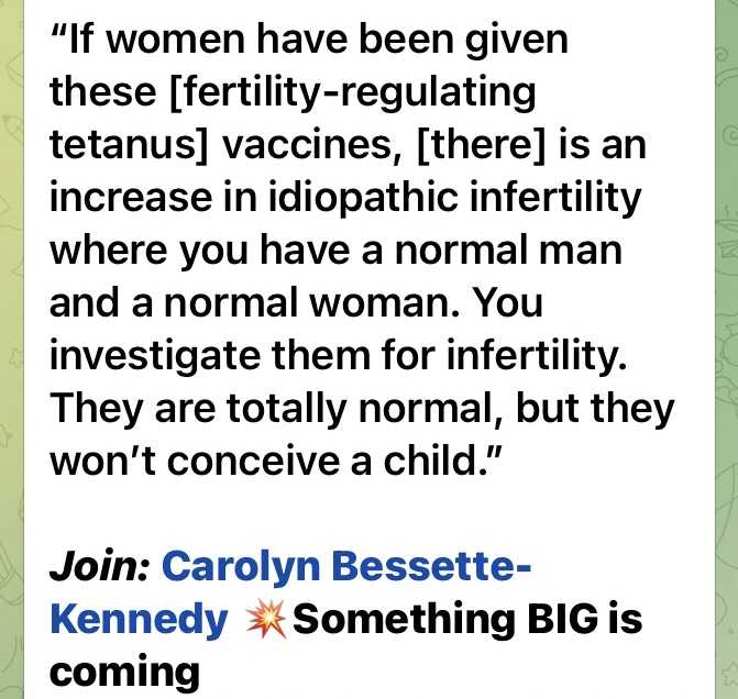 ”もし、女性の生殖能力を規制する破傷風ワクチンを打ったとしたら、普通の男性と女性の間であっても、原因不明の不妊が生じるので、不妊の原因が調べられる。しかし、実際は彼らはノーマルに見えるが、決して子供を授かることはない。”