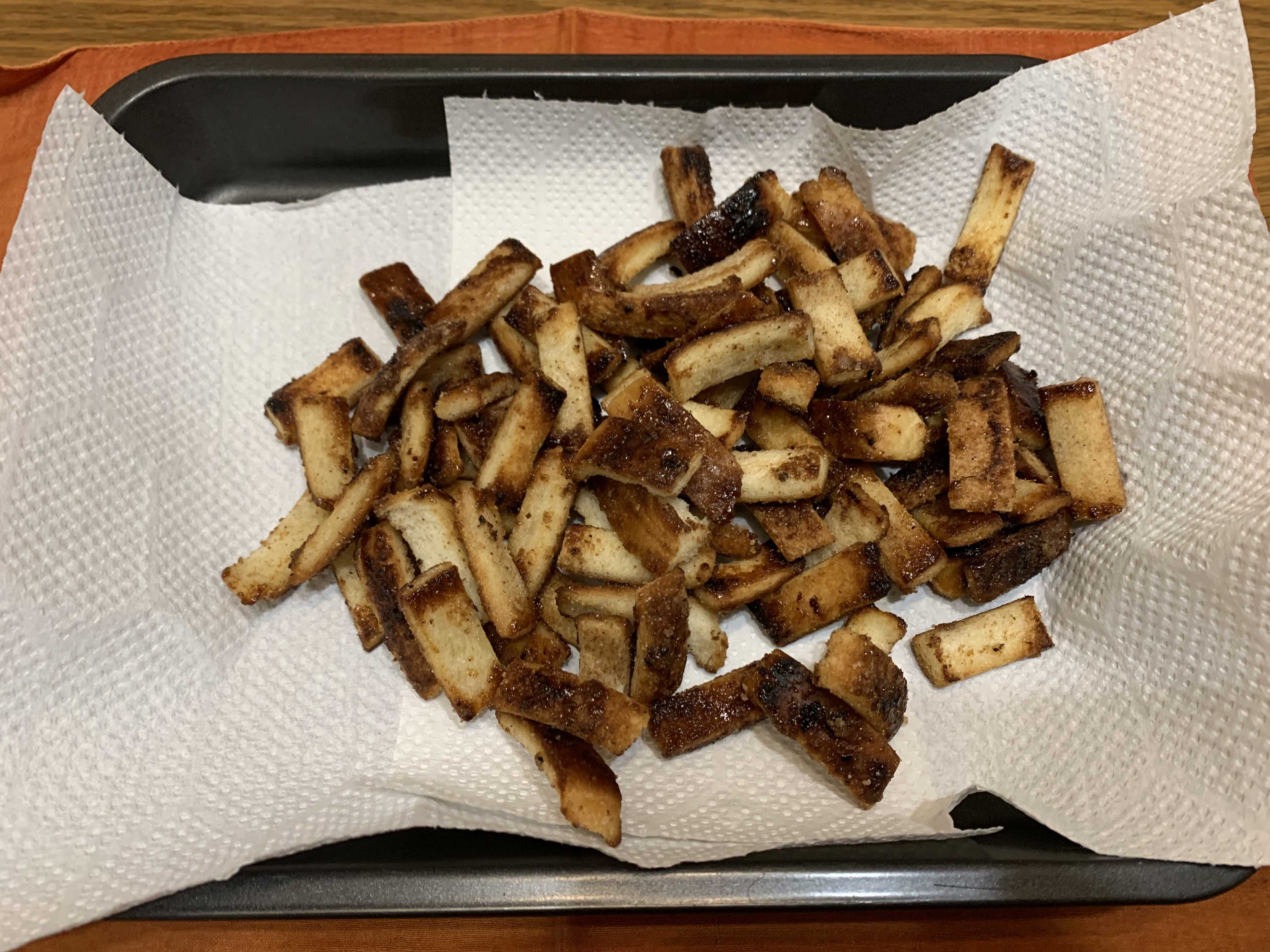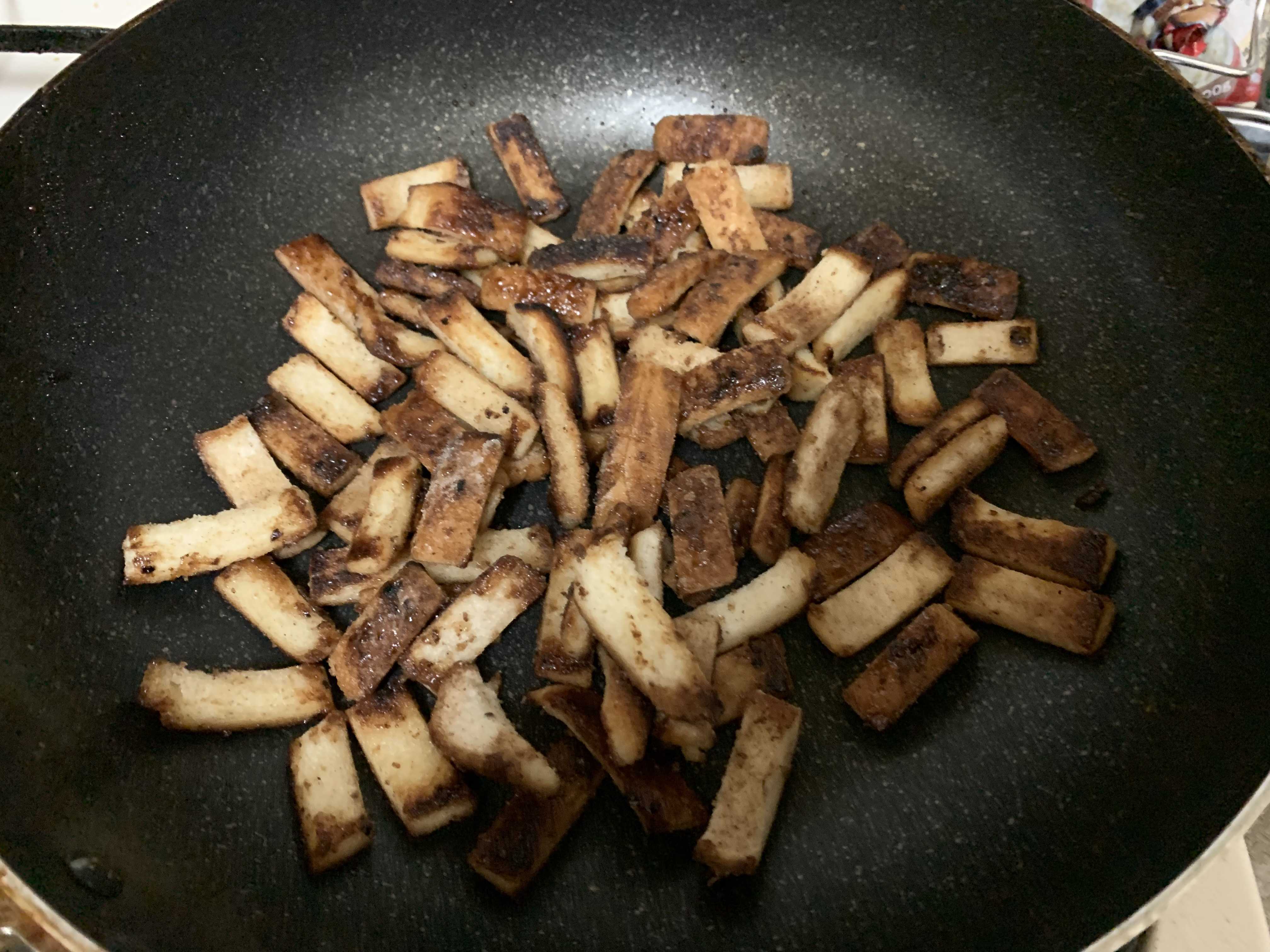 ちょっとの油で炒めて、フライパンが熱くなったら、火を止めて空炒り。