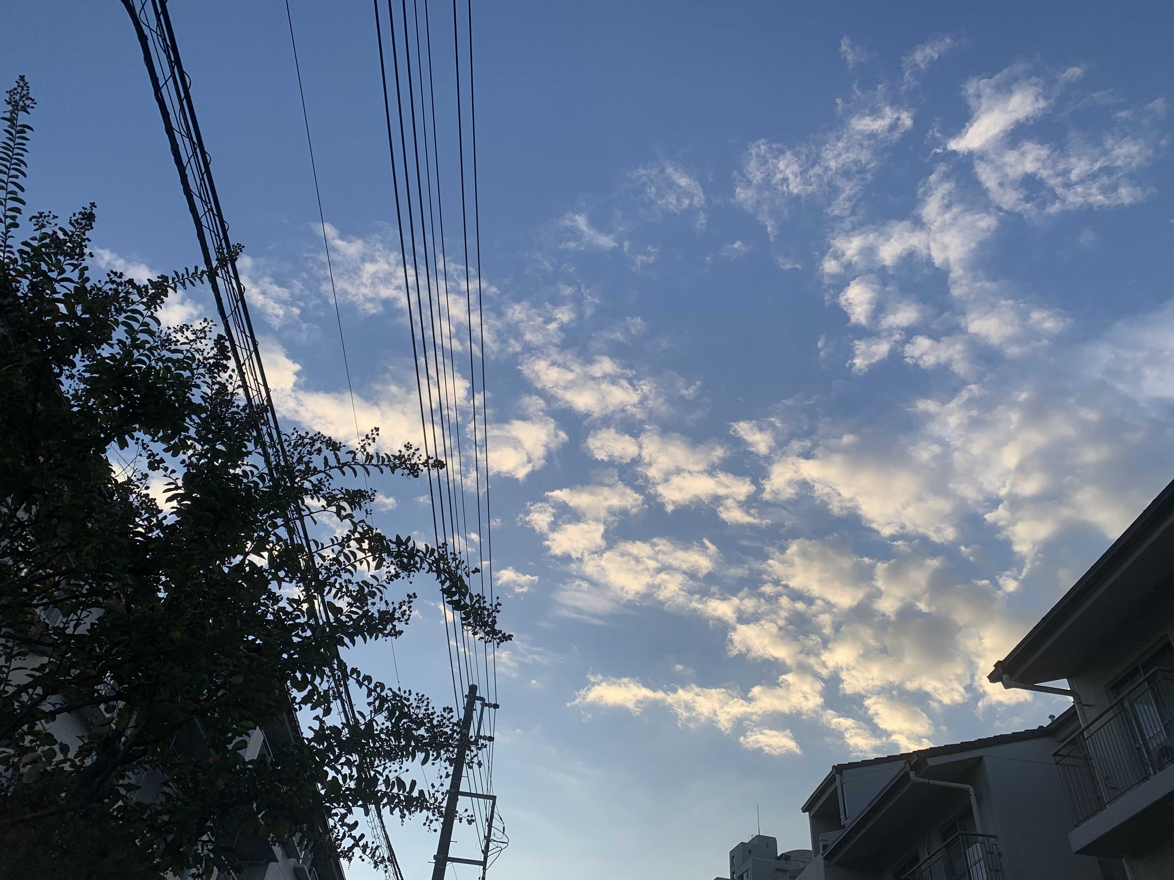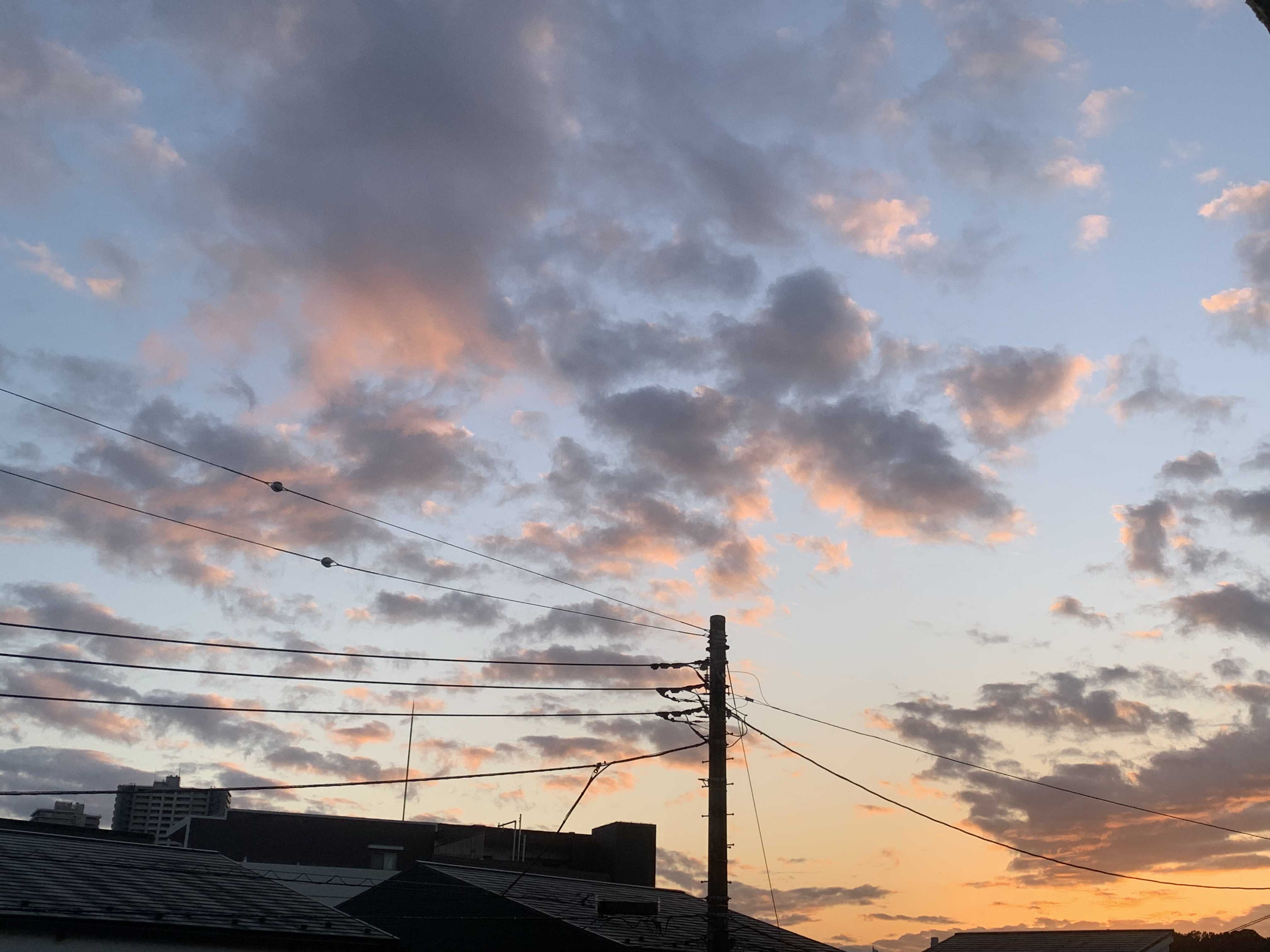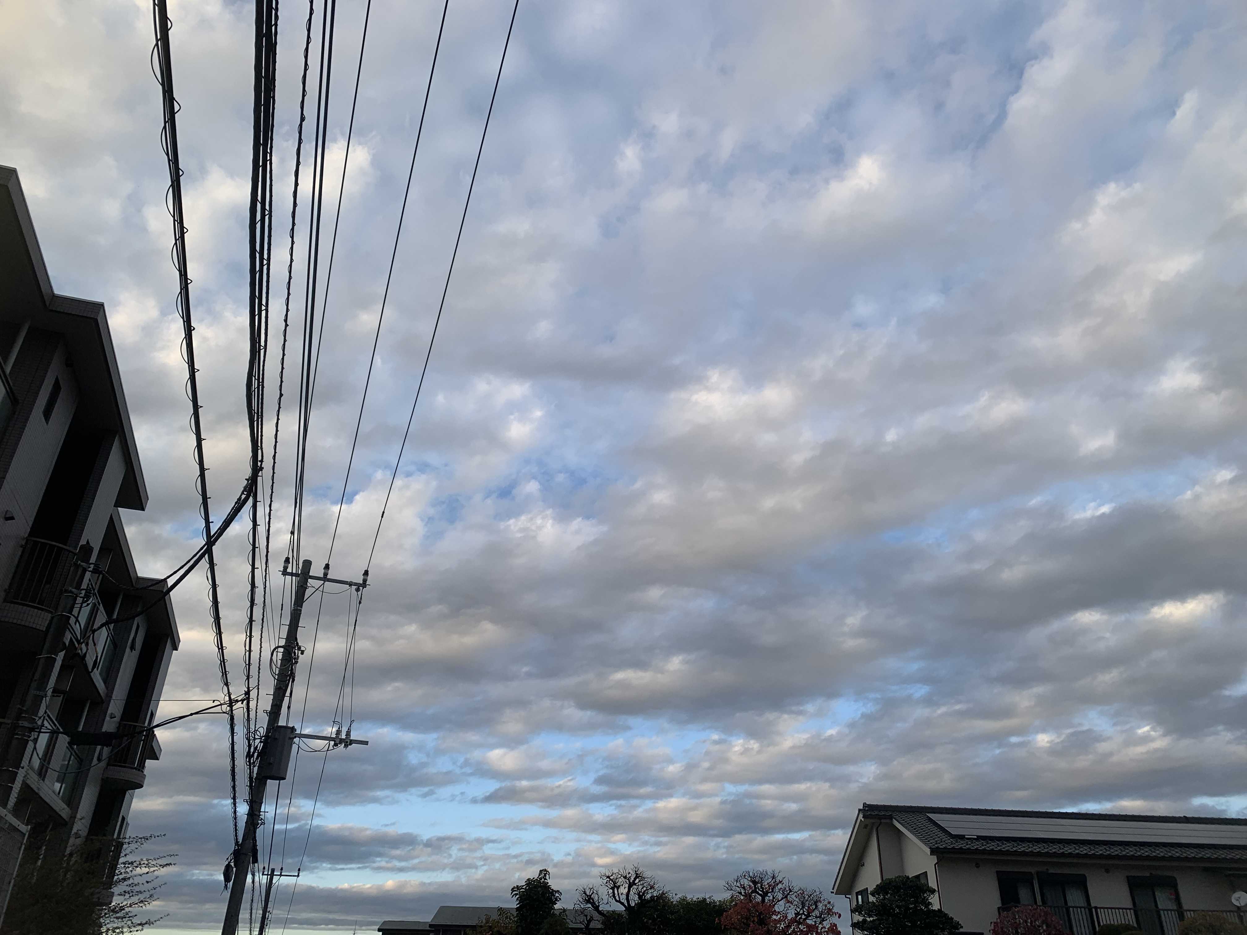 一週間ぶりくらいの気持ちで行ったのに、「お元気? 来ないから心配してたよ〜」と。あら、なんと11月お初でした。まあ最近、先生のアドバイスに従って、足首をレッグウォーマーで2重に温めたり、下半身のストレッチと筋トレを強化したりしてるので、実は調子良いのよ。おかげさまで、特に問題なく過ごせてます。最近サブスクに入った面白い映画情報とか、いつもながら良い情報をたくさんいただきました。こう言うおしゃべり、ありがたいわ。帰りがけに、一枚。すごい雲だ〜。