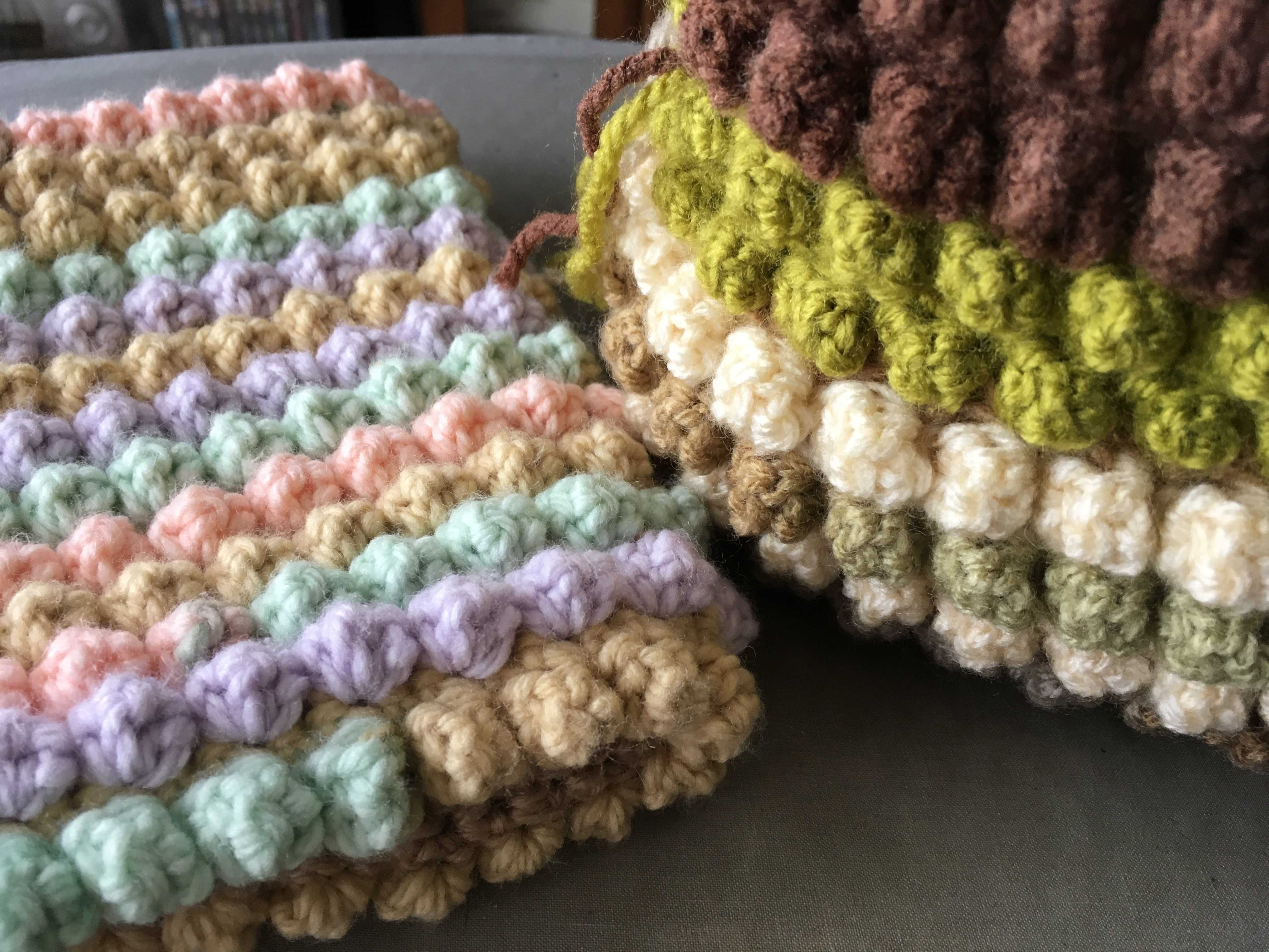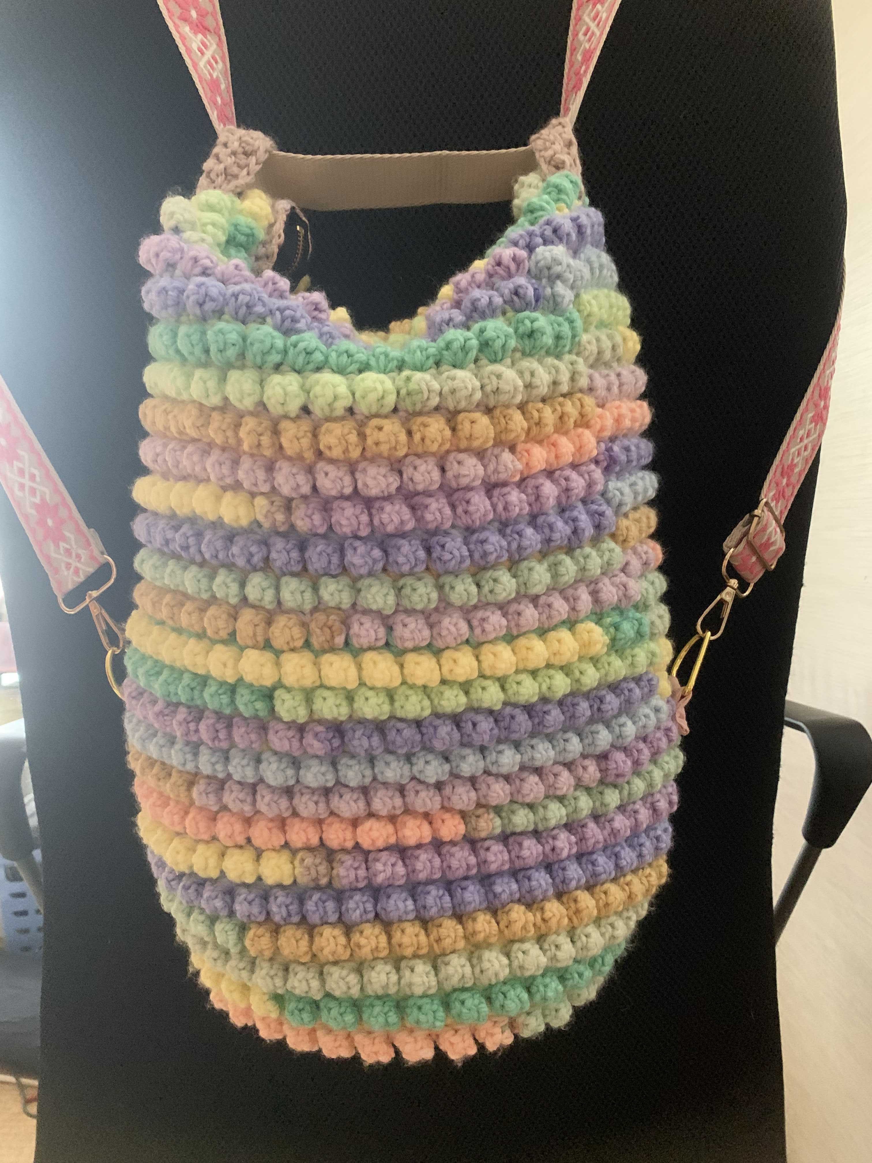 ズダ袋風味背負える形なのですが、実は上のところを引っ張ると、斜めがけのショルダーに早変わり。口はファスナー開き。軽いし、厚手のコットンで内袋を作って縫い付けてあるので、結構丈夫だと思います。身長30センチのみコンコンたちを3匹入れると、ちょうどいいです❤️今度、ミッドタウン謎解きに行く時にでも持ってこうかな。パプコーン編み、気に入ったのでもう一個、今度は横長の大きなバッグを作ってみようと思います。