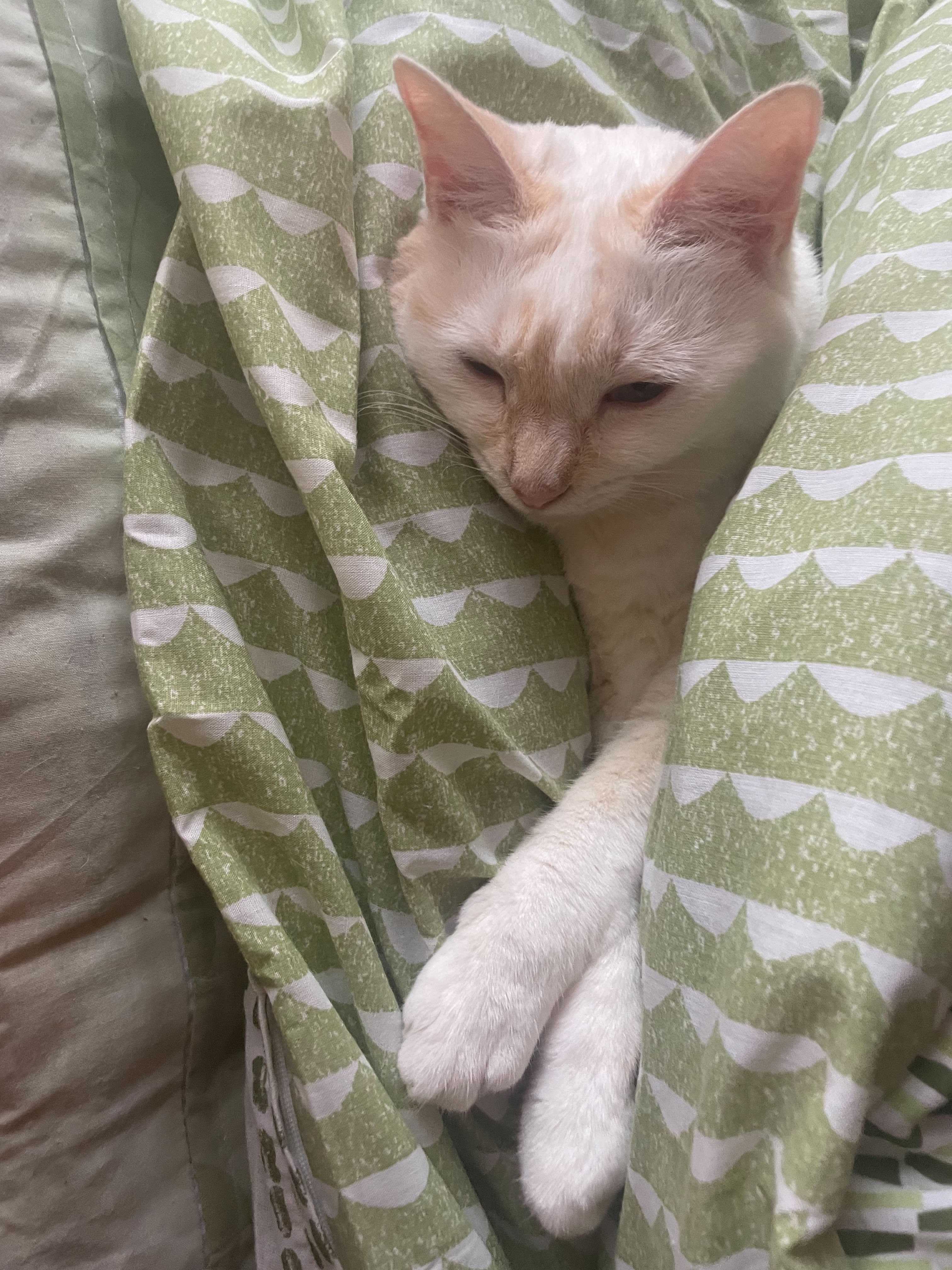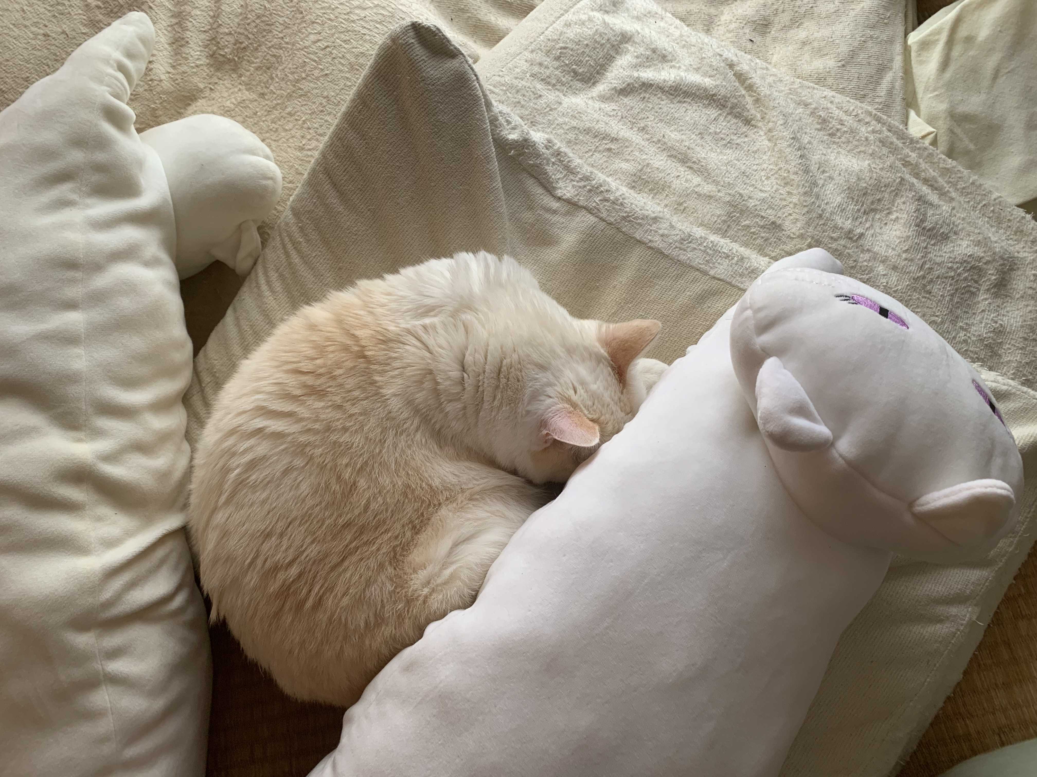やだ、かわいい😍ほんと、可愛い😍クッション各種積み上げて、みこたんベッド作ってます❤️満足そうでよかった。みこたん見てたら、ぺるちゃんを思い出しました。大きくて暴れん坊で、でも人懐こくて、本当に可愛かったぺるちゃん。1ヶ月間ほとんどお水しか飲まなくなって、ずっと部屋の隅に隠れるように寝てて、獣医さんには「もう腎臓が悪くなってるし、点滴でしばらく繋ぐことはできるけど、どうする?」と聞かれ、毎日の通院も提案されましたが、病院までの移動と診察も本当に怖がって、元気だった頃でも、予防接種に行こうものなら3日くらい何も食べずに家の中を匍匐前進する子だったので、このおそらくは最期の時間を怯えさせたくない、と皆で苦渋の決断をしました。家で見取ります、と言ったら、先生は「そう。じゃあね、ぺる、バイバイ」と囁きました。そして数日後、ぺるちゃんが心配で家に帰っていた息子に見守られて、天国に旅立ちました。『ゴールデンカムイ』的に考えれば、きっとぺるちゃんが「この世は良いところだった。だから、お前も行ってこい」と、そっくりの上位互換である(失礼)みこたんを連れてきてくれたんでしょうね。お利口で優しくて、本気で人を噛まない、引っかかない、出来れば女の子がいいな、と、その通りのみこたんです。ぺるちゃんは人懐こかったけど、とにかくよく噛んで引っ掻き、私、傷だらけだったので。唯一、ぺるちゃんは抱っこが大好きでグイグイ頭を押し付けてくるのが可愛かったのですが、みこたんは抱っこ大嫌い。両腕突っ張って拒否してきます。ビチビチ暴れて、逃げてしまいます。ここが皆の不満。でもねー、とにかくお利口で良い子だよね〜、と今日も一日、皆で愛でました。みこたん、最高😀またいつかきっと、みこたんを見送る日が来るのでしょうね。私たち、いくつになってるんだろう。ご近所のネコの会の同志の皆様も、「後期高齢者になってから、ネコを見送るのは辛いよね」といいます。その時に孫がいたら、気が紛れるわよ、という人もいます。まあ、その時はその時。「2人で泣こうぜ」という夫と、なんとか乗り切っていくしかないのでしょう…孫はいないけど、みこたんモデルのみコンコンがいた❣️定年間近の夫、老後は「日本百名山とみコンコン」だの「四国八十八ヶ所巡礼みコンコン」だの提案してきます…やだ、私、絶対歩かないから!