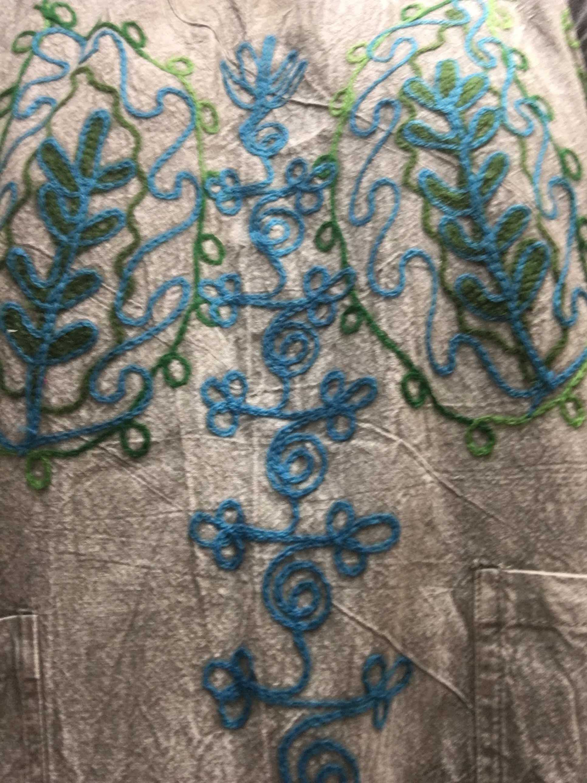 これね、実はエプロン。娘のドライブ練習に付き合ってる時、ショッピングセンターの趣味のお店で、投げ売り価格の棚に吊るされてました。うわー、可愛い、好き❤️ と購入。ご町内の避難訓練の時、白ブラウスにこのエプロンで給食のお手伝いに行ったら、「なによ、原田知⭕️みたい〜」とネコの会の面々に褒められた(?) いや、意図が違うか…? まあいいや、いい方に取っとこう。実はその時、デニム地のと、赤いお花の刺繍のも買ったの。全部で3枚。毎日、「今日は青いスカートだから、これにしよう」とか、喜んでます。嬉しい☺️