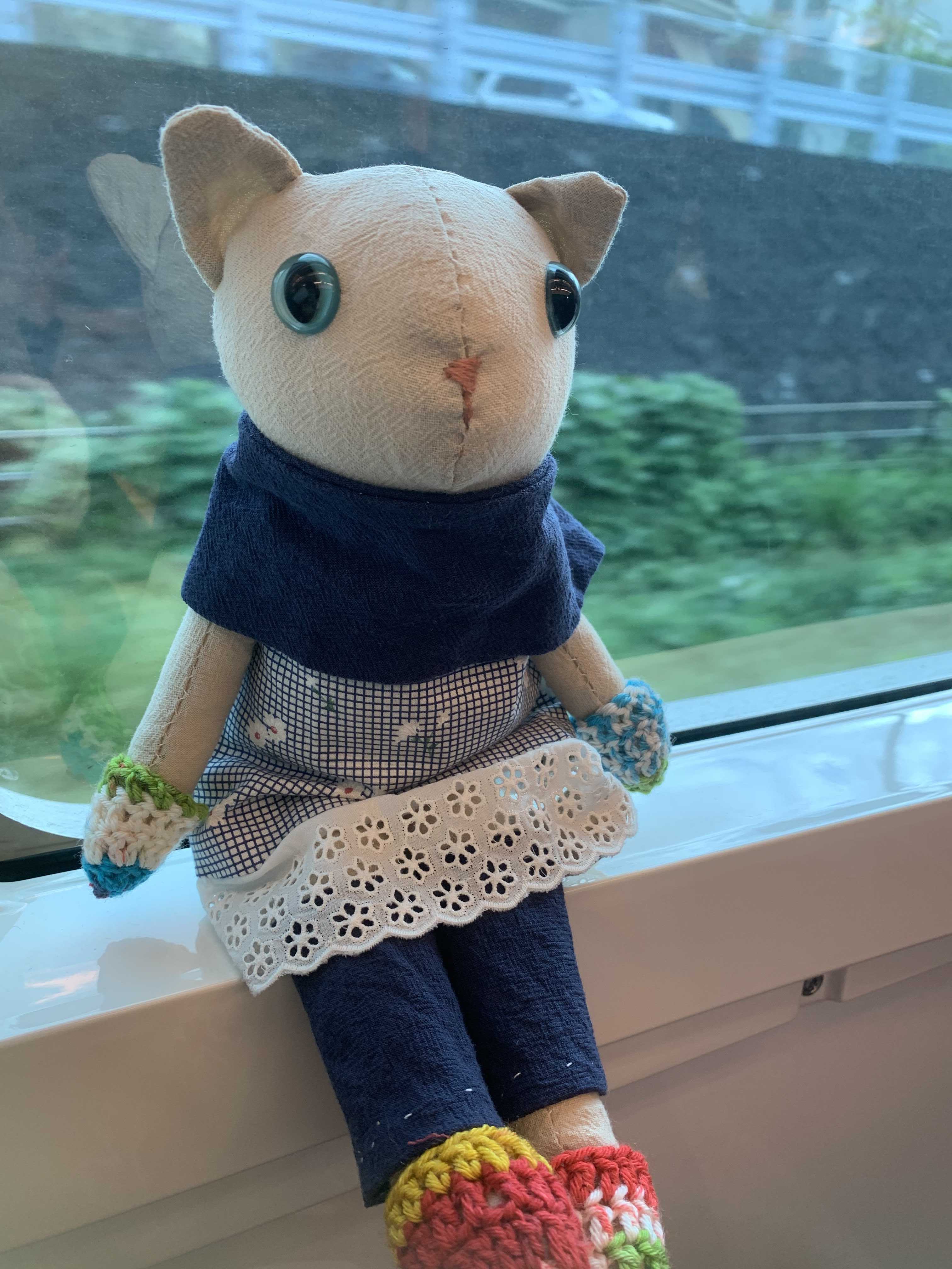 出かけるたびに連れていってるので、割と写真はあるのですよ。電車でお出かけみコンコン1号ブルー。秋めいてきたので、手袋とソックス着けました❤️指定席の特急の座席にて。某都内カフェの壁際で。2号グリーン。空いていたので、端っこの席に座れました。バッグにさっと腰掛けさせて、ちゃっと撮影。あ、手袋片方、無くしてる…(バッグの中に落ちてました)。某駅のホーム、アクリルのベンチが可愛かったので、一枚。金目の3号。平日の午後、誰もいない瞬間があってよかった🤭ある古い町の古い家の片隅で。東京とはいっても、古いものはまだまだ残っておりますね♪何かね、ここ12、3年、「お出かけ」は全て「謎」がないと始まらない、だったのですが、最近は「謎活」プラス「みコンコン活」(ヌイ活、と言ってもいい? 仲間に入れてもらえるかな?)になってきました。もちろん、謎がなかったらわざわざお出かけしないので、謎解き参加は必須なのですが。昨夜は全員を秋服に着替えさせました。手袋、ソックス、マフラーを着けて、足元もニットの白いレッグウォーマーに交換。(娘の毛玉だらけになった薄手ニット、廃棄前に有効活用出来ました)。今度、おしゃれな謎に行く時、連れていこう。それから、冬用のお揃いのニットワンピを製作。地色はくすんだピンクでお揃いにして、それぞれのテーマカラーのポケットをつけました。これも、材料は娘の着倒した去年のニットです。楽しい😀多忙な夫が、12月初めに少し休めるから旅をしよう、と言うので、そこで着せようと思います❤️楽しいねえ😀