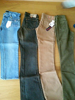 本日午前中にシック&シンプルさんの商品が届きました。早速撮ってみましたまずは全体図を…バックはターコイズというよりはエメラルドグリーンっぽくて良かったです!!写真だとやっぱりブルーに見えるんですけどね。まずは、こちらのパンツハンパ丈カーゴパンツ横のラインキレイでした^^夏に活躍するでしょう~!次はこちらCIMARRONシマロン LISA-LY-NEW RELY9ダークヴィンテージウォッシュデニム横のラインここまでは良かったです…問題ありの2点を紹介です…CIMARRONシマロン カラージーンズ美脚フレアーパンツ股下のサイズが79しかなくて、ちょっと足りません…まだ、これはいいですが、次がちょっと…CIMARRONシマロン CIM171200BUT(バット)コーデュロイ ブーツカットパンツ股下が84のはずなのに、かなり短いです…。これは大雑把な私もさすがに履けません…。測ってみたら上のベージュが股下79.5、下のカーキが75でした。表記では両方83はあるはずです。普段ジーパンは股下85以上で履いているのでちょっと厳しいです…。ちなみに上で履いている問題の無いヴィンテージのジーンズは表記は股下90なんですよ。でも、85くらいしかないです。さすがにお店に連絡を入れました…。でも、どうやら対応はとても良いショップみたいなので、受け付けてもらえると思っています…。と信じたい。現在、メールが多くなっているそうで返事に時間がかかってしまい、すぐ行動が取れないのが辛い…。ヴィンテージはめちゃくちゃ伸びる生地でびっくりしました。その他はよそと大して変わらないと思います。こちらのお店のポイントは1本1本、注文する時に股下サイズを確認することですね…。