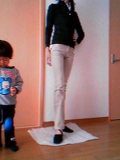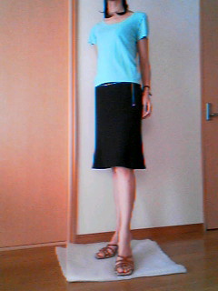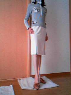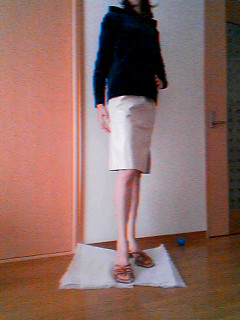 ねこだんさんのネタバレを見て、私もスカートを履いてまねっこしました。実はこのお洋服は注文時にお店の方が身長の高い私を心配して聞いてきてくれました。トップスの着丈は良いんですが、袖がいつも足りないんです。と好意に甘えさせていただきました。普段お店の方は私用に丈を長く製作してくれていたんです\(◎o◎)/!本当にセミオーダーのお店みたいです!ところが出荷後に着丈の調整を忘れて、他の方と同じ丈にしてしまったのでもう一度送りなおします…と連絡が入りました。どうしようか悩みましたが、スカートでもウエストがギリギリ見えてしまう位だったので申し訳なく思いながらお願いしました。そんな経緯で昨日洋服が届いたんです。今回10センチ長くしてもらったんですが、今回のお洋服の丈が短かったのが分りました。まず、写真を見てください。分りやすいように同じ服で撮っています。撮っていた時にちょっと長いかな?と思い5センチくらい折り曲げて撮り直してみました。5センチ短い方がスタイル良く見えますよね。こちらも5センチ短くした方がスタイルが良く見えますよね… ラインがキレイです。今更ながらに感動しちゃいました。