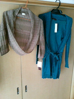 ちゃんと到着するか不安だったNAVANAさんのオープン記念福袋。昨晩発送メールが届きました^^受注メールが来なくて心配していましたが、どうやらこちらのメールの方が調子が悪かったみたいで、こちらに届いていないだけでした。フリーサイズなので問題ないと思いましたが、念のため身長が高いことを備考欄に書いたら、なんとお店の方が考慮して丈が長めの服を入れてくれました。ありがとうございました!Sに近いMサイズだと困るなぁと思っていた程度だったのでうれしかったです☆小物に不良な場所が2箇所があったので、写真で見てあれ?と思われるかもしれませんが、気にしないで下さい^^;お安い商品だったので、自分で直してみようと思います。では、早速はじめま~す!17枚も写真があるので、気長にみてください(笑)では、商品自体をハンガーにかけた状態で撮ったものです。左の商品、届いた時はどうやって着るのか全然わかりませんでした(笑)1分くらい触っていてやっと分りましたよ。ボレロ風ですね^^ロングニットはへちま襟です!使えますね~!生地の至る所に穴が開けられています。これは穴さえなければ着れるんですが…。これが痛い…。こういうテイストが好きな友達がいたのであげようかと思います。喜んで着てもらえたほうが服もうれしいと思うので。左が黒のパーカー、右も黒のジャケットです!これは両方綿ですし、デザインも私好み^^右のジャケットはちょっと工夫があるんですよ♪それはのちほど…トレンチコート。これ良いですよ!色は黒だけどシルエットがキレイです!襟に工夫がされていて、少し立ちます。なのでスッキリ見えます。黒は丈が長めで、まだアレンジがよく分かっていません^^;キャメルは少し透ける素材みたいですが、意外と大人っぽいですよ~チェーンベルトが入っていました!真ん中でチェーンが切れているのと、ラインストーンが取れてしまったものがありましたが、まぁ、他人にそんなに細かくベルトを見られることもないと思うので、チェーン部分だけ後でつなげてみます。計8点とのことでしたが、9点も入っていました服たちを着用してみました!ジーンズだと全て合いそうだったので、それ以外(全てクゥさん)で合わせてみました。ちょっと息子に首を絞められています…。ボレロはちょっと羽織るのに便利そうです。軽いしコンパクトなので、お出かけする時に持ち歩きます。もちろん普段にも羽織ります。ロングカーデです。色も好きです。ベルトをしないでもっと上のほうで留めてみたらどうだろう?とやってみたらちょっとおばさんっぽかったので、ベルトを留めるか、ベルトを結ぶ辺りにブローチやコサージュで留めると可愛くアレンジが効きそうです。穴あきジャケットの襟を開いた状態で着て見ました。こちらは襟を一番上まで留めた状態。雰囲気が変わりますね^^黒のパーカー。袖が短かったので、いっそのこと7分として着ようと少し腕まくりしました。スカートでもいけます。スタンドカラーの黒ジャケット。綿なので1枚でもOKです。春、秋に着れます。そして、袖には金具が付いていて、袖をデザインすることができます。私はまくり上げただけですが、シャーリング?(って言う?)する人もいるのでは?メイン?(たくさんあってどれか分らない^^)のトレンチです。どうですか?キレイですよねっパンツじゃ当たり前かな?とスカートでも撮ってみました問題ありません~~(#^.^#)使えます!このコートシンプルトレンチコート追記→お店で実際に販売されていると教えていただきました。ありがとうございます!くまこさん^^黒のロングキャミ。これでいいのかしら?これだと丈の短めのジャケットだったらバランスよく行けそうですね。体のラインにぴっっった~~~っとくっついてオリマス。何故か安心して着れます。おなかが冷えないから?ラスト、キャメルのカシュクールタイプです。ちなみに下着以外つけていませんが透けませんね?1枚で行けそう。着てみるとこれも体のラインにぴたっとくっつきますが、気持ち良いですよ。予想通り?写真どおりというか、着られるものが多い福袋でした。実はお店の方が気に入ってもらえるかどうか心配されていたんです。2回も、気に入ってもらえればいいんですが…とメールに入っていました(笑)ここまで心配してもらえるととってもうれしいです♪商品も気に入りましたし、親切なお店だったので気に入るものが見つかったら利用して見てくださいね!←クリックするとNAVANAさんのお店にいきます。