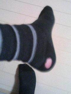 朝はく時に「かかとがすり切れてるなぁ、肌が透けそう」と思っていたら、案の定だ。