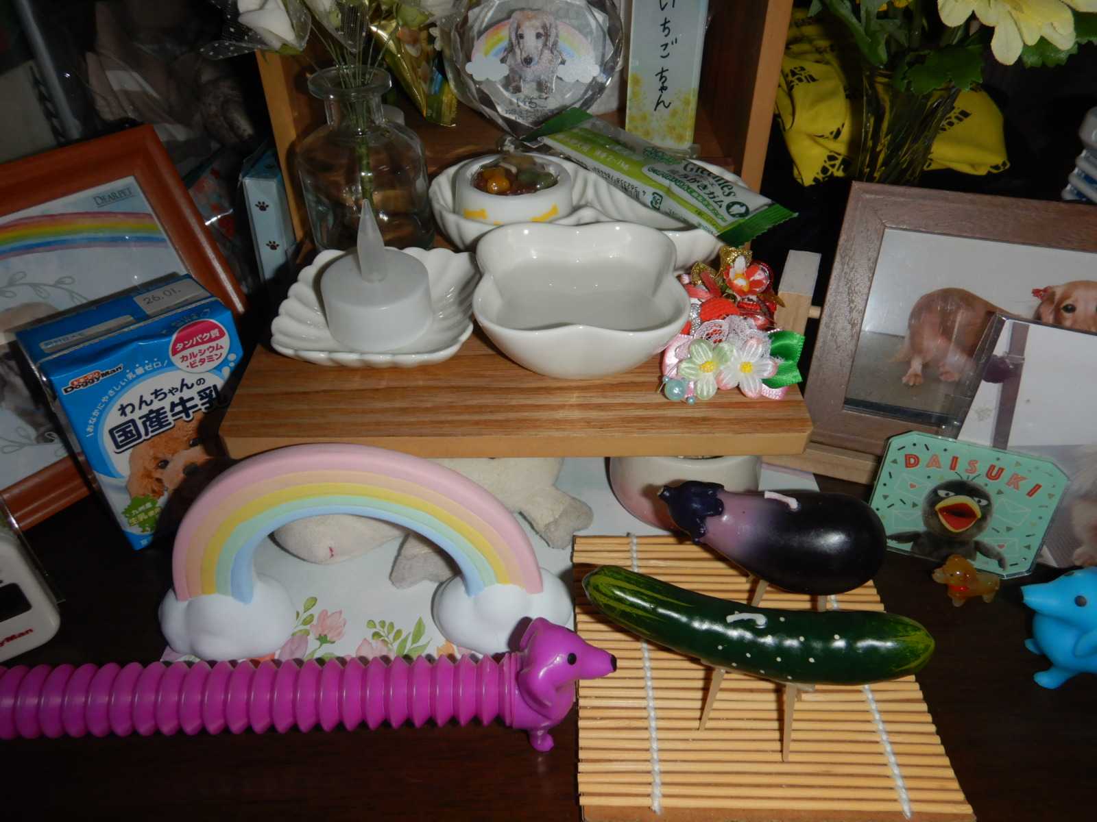 相変わらずに暑い毎日が続きますが13日に準備した、いちごちゃん用の「精霊馬」も、早いもので盆明けの本日は、片付けとなります馬(胡瓜)で速く帰ってきましたが明日は、牛(茄)に乗ってゆっくり戻っていくんですね…まろんちゃんの届かない所に置いていたので、抱っこをした時にしか?見えないけれど、何だろうって風に興味がある感じでした