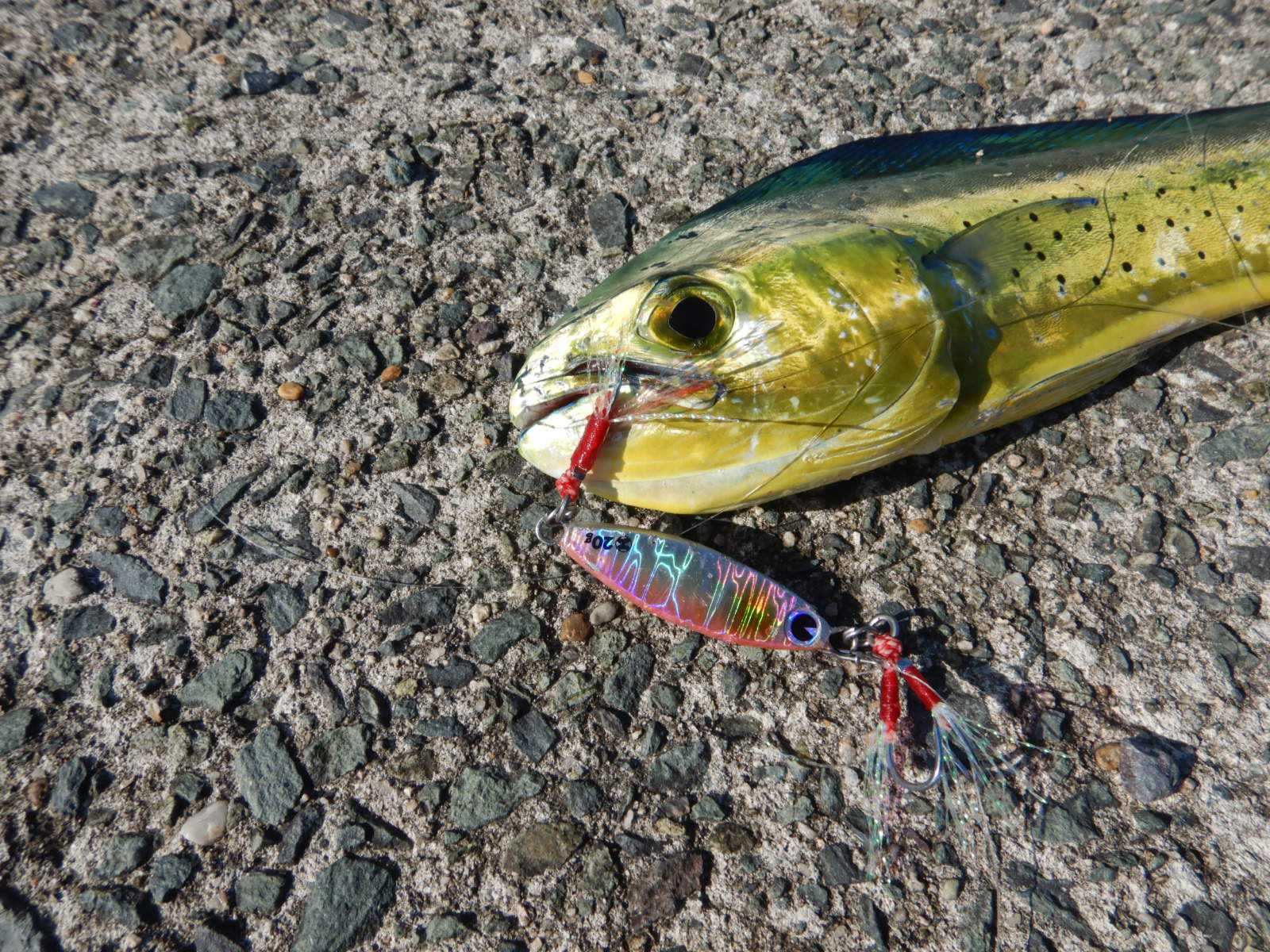 前回のエギング時、小型青物がエギにチェイスしてきたので、メタルジグをキャストしていると、ジグが沈まずにあれ?浮きゴミに掛かった?かな?と思ったら生命反応がありましたあまり引かなかったので何だろうと思って巻いているとシイラの幼魚がヒットしていましたサイズはともかくでしたが…シイラを釣ったのは始めてでした