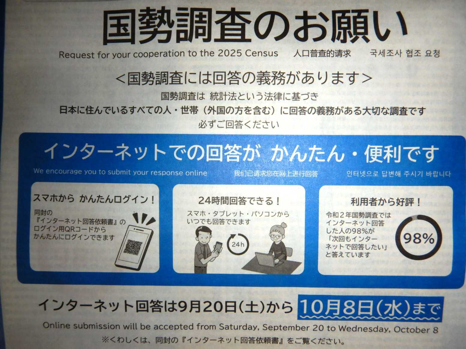 2025年は、国勢調査の実施年ですね我家には、少し前(配布期間前?)に調査票一式が配られました調査員に見られて困るような秘密も無いですが、回答の記入も面倒だし状況変化もないので、ネット回答が可能になったら、さっさと済ませるつもりです