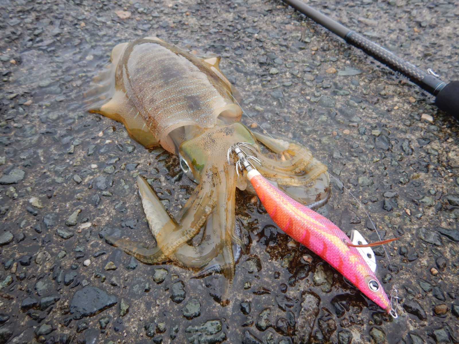 先日は、偵察がてら日本海(山陰)へ秋エギングに行ってみました渓流の涼とは大違いのカンカン照りで暑くて大変でしたが「アオリイカ」の反応に期待して、3.0号エギを使ってシャクリ始めましたですが期待に反して、反応が無いのでチョロチョロと移動しながらシャクリ開始から30分後にやっとのことで「アオリイカ」が掛かってくれました予想したより大きかったし、初物なのでキープさせてもらいましたそれからは、暑さとの戦いって感じの中時折、この時期サイズが掛かりましたこの仔は足場が高くリリース困難でキープしましたが、その他は優しくリリースしました******************************【当日の釣果(7時45分から12時まで)】アオリイカ × 6杯【当日の潮】小潮 満潮…02:45、干潮…12:12波 1.0メートル【タックル】ロッド:ダイワ エメラルダス エクストリーム 7102ML-SVリール:ダイワ 12エメラルダス 2508PE-Hライン:PE0.8号(YGK アップグレード X8)リーダー:フロロ1.5号(ユニチカエギングリーダー2)エギ:3.0号 (エギ王K)******************************