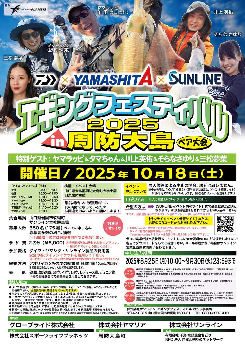 私は、参加する予定はありませんが10月18日に、エギングのイベントがあるようです開催日:2025年10月18日(土)募集期間:2025年8月25日(月)10:00 〜 2025年9月30日(火)23:59開催場所:釣場は瀬戸内一帯参加費:¥6,000(2名分、参加賞代・保険代含む)対象魚:アオリイカ(岸釣りで釣り上げたイカに限る)参加資格:ダイワ・ヤマシタ・サンライン製品の愛用者で ペア(二人一組)で参加できる方本日が申し込み締め切り日のようですね