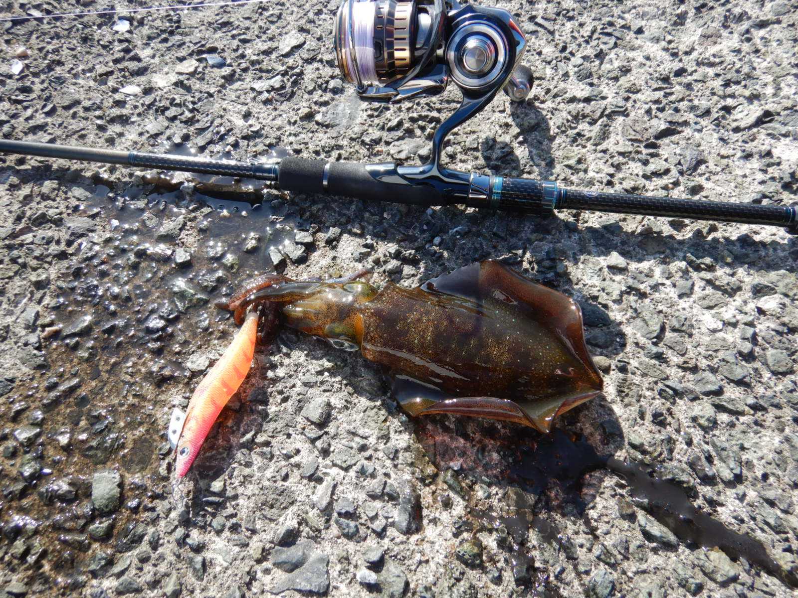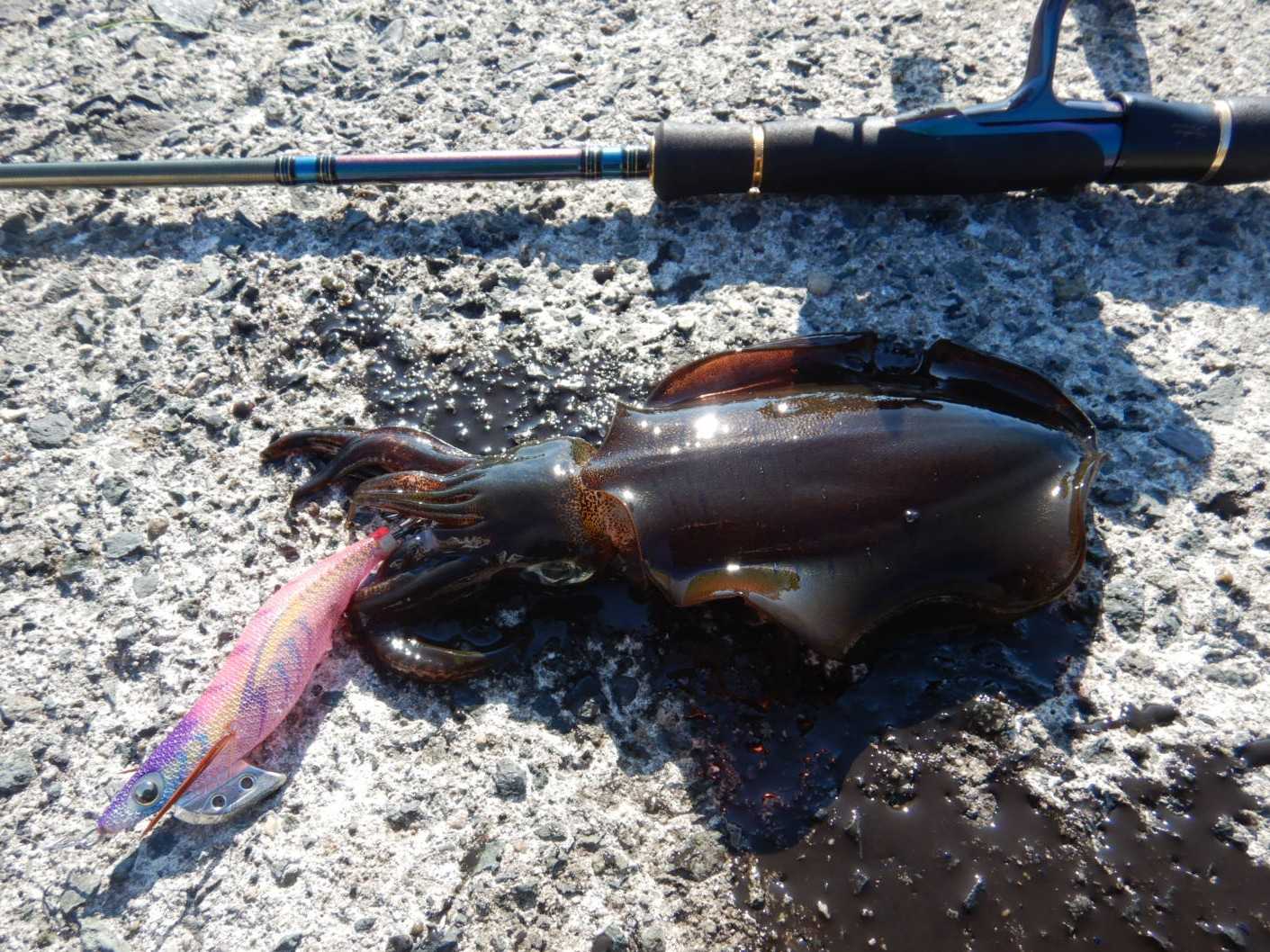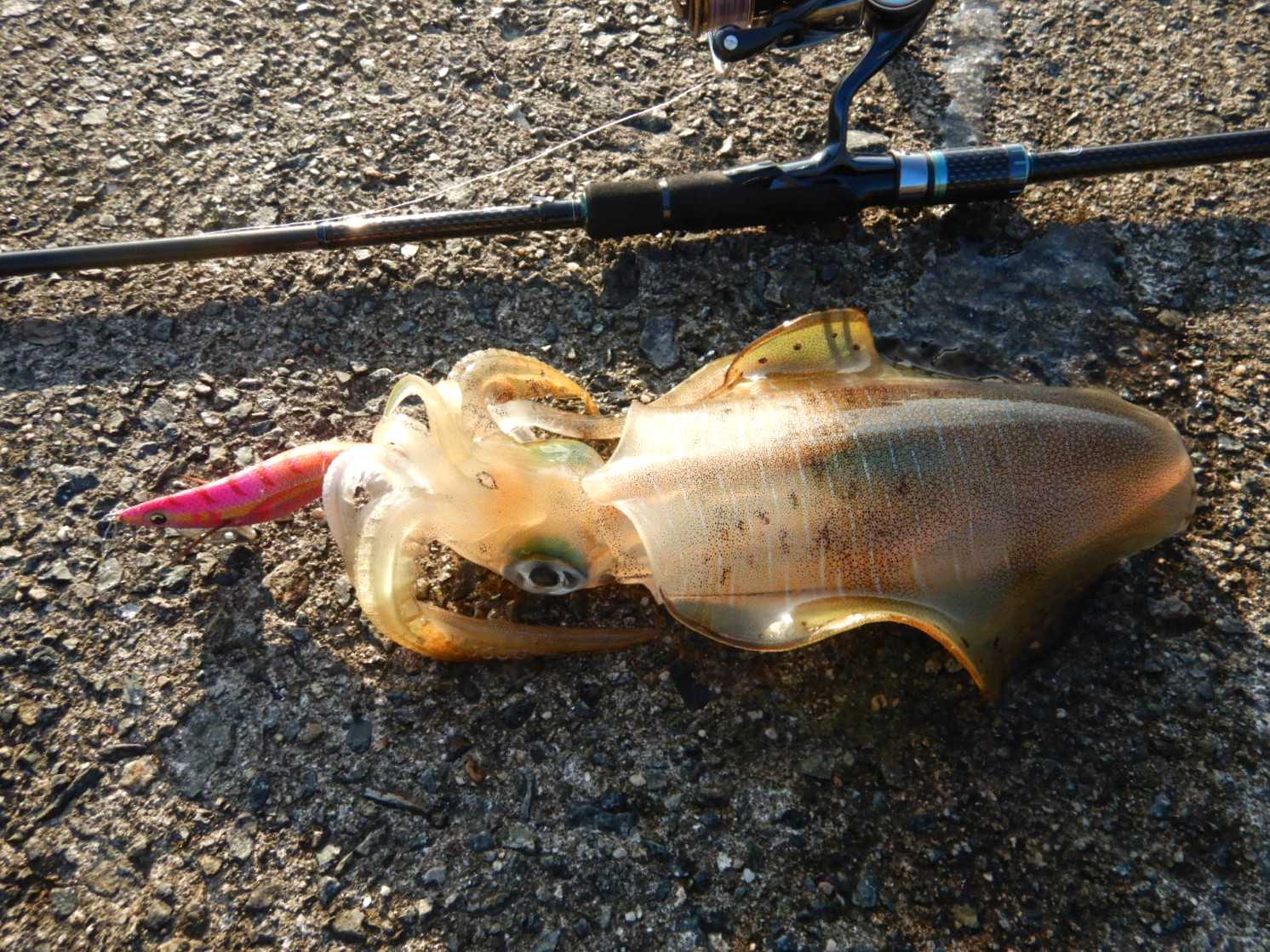 先日は、2回目となる秋エギングに出かけてみました既に、強い日差しの中の開始なので熱中症に気を付けつつも、ラインに注視してシャクリを入れますが…反応も無いし、姿も見えない感じ潮目が来ないかと少しずつ移動して開始から一時間少々が経過した頃に沖の底でイカパンチをくらったので改めてシャクって落とすとツンってラインが引き込まれて「アオリイカ」がヒットしました少し後、ラインがフッとふける中りで釣れましたが、それからは反応も無く暑さとの戦い?でした何とかアオリが来ないかとウロウロし真っ黒に興奮した個体や潮目の中からは色白の「アオリイカ」もきてくれましたが潮目が逃げてからは、反応も消えたし何より暑いので早めに終了しました******************************【当日の釣果(7時15分から13時15分まで)】アオリイカ × 6杯【当日の潮】中潮 満潮…10:40、干潮…18:38波 1.0メートル【タックル】ロッド:ダイワ エメラルダス STOIST AGS 90ULL-Sリール:ダイワ 19セルテート LT2500S-XHライン:PE0.8号(アバニ エギング マックスパワー PE X9)リーダー:フロロ1.75号(シーガー グランドマックス FX)エギ:3.0号 (エギ王K、エギ王SEARCH)ほか******************************