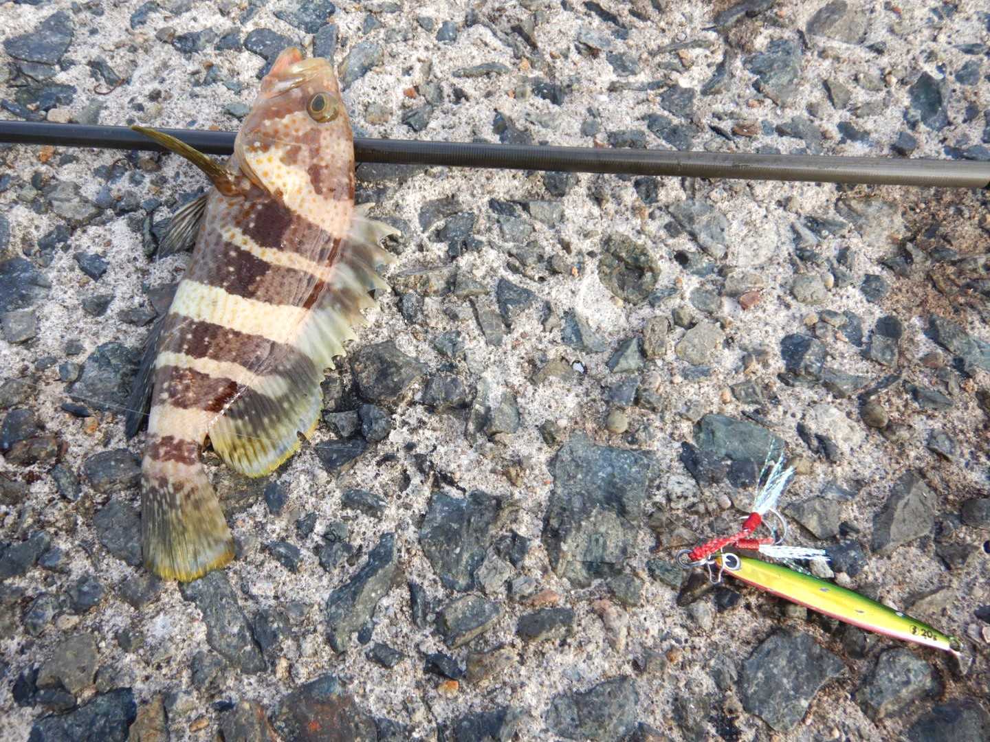 一昨日は、山陰(島根)へエギングに行ってきました今秋は、釣れない印象が強いのですが時期的に多くのエギンガーで賑わって何時もの場所に駐車できなかったので別の場所に入ってみました素早くチェックする為、ハイピッチでダートさせていると、ギラッ!とした魚影が見えた途端にテンションが抜けエギが無くなってしまいました犯人探しの為に、メタルジグを結んでワンピッチでシャクっているとまたも切られちゃいました…次のキャストでは、ちゃんと掛かって上がってきたのは可愛い「アオハタ」でしたでも、この子は犯人ではない筈なので引き続き犯人捜しをしていると可愛い「サゴシ」が上がりました予想通りの犯人でしたが、これではエギも切られて釣りにならないので暫くメタルジグを投げていましたサイズアップの「サゴシ」がポツポツバイトしていましたが、反応が消えたのを見計らって、エギングを復活して広範囲をシャクっていると10時過ぎに待望の「アオリイカ」がヒットその後、ボトムステイ中にくいっとひったくられるバイトがあったのに掛けることが出来ず…それ以降は反応も無いし、またもやサゴシが回ってきたので、昼過ぎに終了としました******************************【当日の釣果(7時15分から12時15分まで)】アオリイカ × 1杯アオハタ × 1匹サゴシ × 6匹【当日の潮】中潮 干潮…10:17、満潮…14:21波 1.0メートル【タックル】ロッド:ダイワ エメラルダス STOIST AGS 90ULL-Sリール:ダイワ 19セルテート LT2500S-XHライン:PE0.8号(アバニ エギング マックスパワー PE X9)リーダー:フロロ1.75号(シーガー グランドマックス FX)エギ:3.0号 (エギ王K、エギ王SEARCH)ほかジグ:20g(GUN吉、GUN蔵、GUN助)ほか******************************