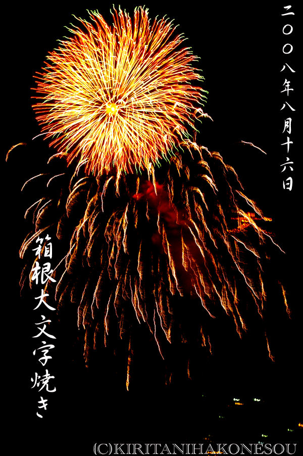 そうそう…大文字の夜は、お月さまがキレイでしたね~~~。とても明るい月夜でした16日の画像、『大』という字と花火が重なってしまったので、『大』がはっきり写ったものをアップしますね(過去のブログはこちらからどうぞ http://kiritani-hakoneso.seesaa.net)掛け流し大涌谷源泉の濁り湯が自慢の美人の湯宿『桐谷箱根荘』のオリジナルHPはこちら http://kiritani-hakoneso.com/index.html