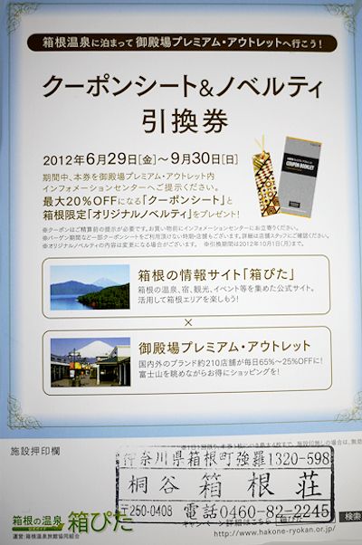 2012年9月30日(日)までの期間中、コチラの引換券(施設内にご用意)を御殿場プレミアム・アウトレット内インフォメーションセンターへご提示下さい!最大20%OFFになる"クーポンシート"と箱根限定"オリジナルノベルティ"がプレゼントされます。 箱根強羅温泉 桐谷箱根荘のfacebookはコチラ☆ 桐谷箱根荘の公式ホームページはコチラhttp://kiritani-hakoneso.com/