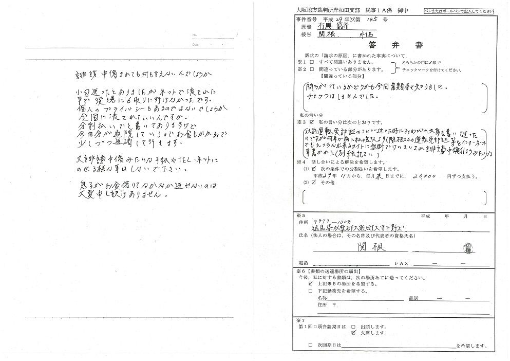 [7月12日:多川の居場所を探す]問題は多川です。関根がいるので7月19日に岸和田で地方裁判が行なわれます。そして、当日19日に判決が出ます。なぜならば、関根は来ないと思うのです。(来れば当日では無いです)しかし、関根から裁判所に提案書が届いています。月付き1~2万円の分割払いです。もし、2万だとすれば元金が790万円で現在869万円の請求ですから。(逃げた5年前から年当たり2%の金利を請求しています。)判決で今後も2%が認められるかどうかが微妙ですが今後の金利を取れないとしても869万円です。更に減額されて、元金の790万円に成ったと仮定しても年24万円ですから33年かかります。がんばって869万円を認めてもらい。今後の金利を取れないとして2万円なら36年以上かかります。関根は33~36年も生きないと思います。長くて20年でしょう。後の13~16年分は遺族が支払うと言う事に成ります。つまり逃げている多川が払わなければ行けません。逃げているので裁判所は財産放棄を認めないでしょう。元々は自身の借金ですからね。ザマアミロです。(^。^)y-.。o○来ないのであれば提案書も効力が薄いです。代理人の弁護士が来れば別ですが書類一枚出しただけでは認められないケースが高いのです。来ないのであれば法廷を軽んじた事に成り裁判官の心象が悪くなります。ゆえに、猫の有馬の主張が認められるケースが高く成ります。つまり、869万円+元金の残金に対して年2%の金利です。869万円-年当たり24万円返金=残金845万円なので元金の790万円に対する金利が、そのまま発生します。年当たり158,000円ですゆえに845万円+15.8万円=860.8万円となり1年目は869万円から8万2千円しか減らないのです。元金を割るには9年以上かかります。家のローンの様ですね?これでは堪らないので月々3万円とします。年当たり36万円36-15.8=20.2元金を割るには4年と成ります。5年も短縮できました。そうすれば30年位で完済かもしれません。20年支払い。残りを遺族が10年位、月付き3万円を払い続ければ完済と成ります。30年だから猫の有馬は85歳ですね。年金+3万円ですから結構うれしい状態です。来て主張すれば元金の790万円も減額される。と思います。(最悪のパターン500万円で金利なし。そうすれば2万円で20年で完済です)来ないとなれば猫の有馬の主張が全面的に認められ、上記の請求に成るのです。一生、払い続けて残りは遺族が代わって支払い続けなければ成りません。つまり来て主張し減額に成功すれば2万円で20年で完済ですが、来ないとなれば、3万円を30年位払い続けないと行けません。これが、【欠席裁判】の怖さです。裁判所の要請で多川の所在を追わなければ行けませんが。『生活保護』の立場では【今月】は動けないのです。『福島』ですから往復二日休憩と調査で一日で計三日は必要です。まだ調べてはいませんが電車を使い旅館に泊まりレンタカーで調査(欠席裁判になると多川と関根の両方が調査対象に成るらしい)したとしても2(電車)+1(旅館)+1(レンタカーとガソリン)=4万円以上必要です。こちらでレンタカーを借りて車で寝たとして、3(レンタカー)+2(高速往復)+1(ガソリン満タン返し)=6万円以上が必要です。生活保護は7~8万円ですのでまたもやライフラインの支払いが出来なくなり、そして『つかさちゃん』に会えない。と成ります。(>_