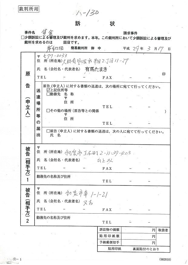 事件名 貸し金 ハ-130 請求事件 岸和田簡易裁判所 提出の為