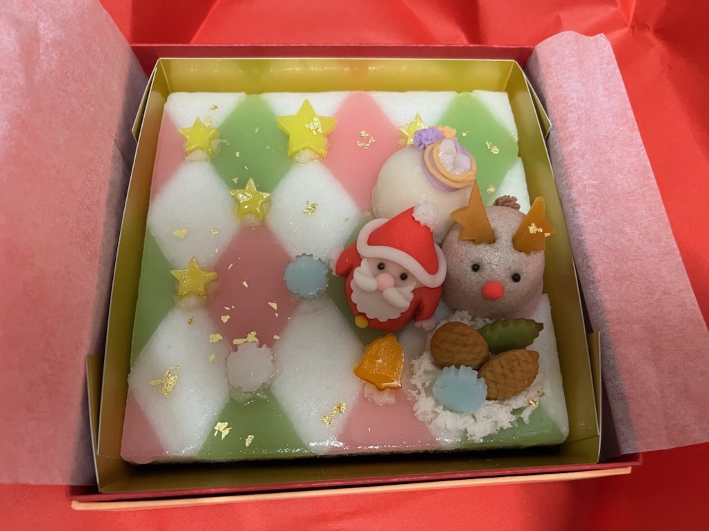 10年ほど前、チョコレートやクリームより和菓子の好きなお花の先生のお孫さんに、と、和菓子のクリスマスデコレーションケーキをお願いして、大好評をいただいてから毎年作っていただいて、和菓子好きの方達にお歳暮にお贈りしています