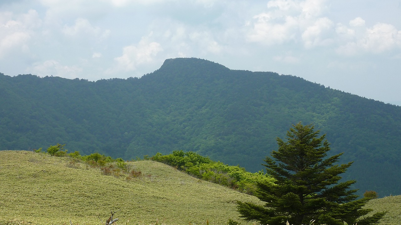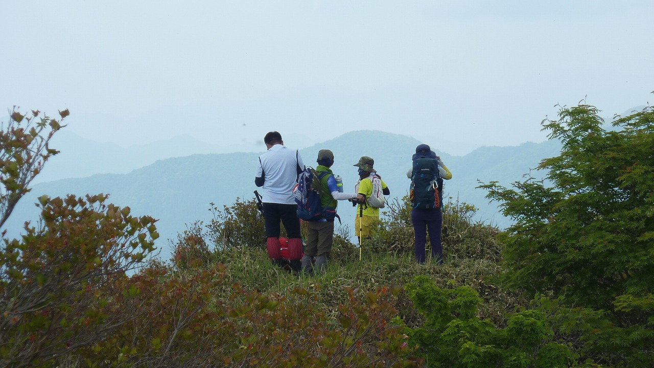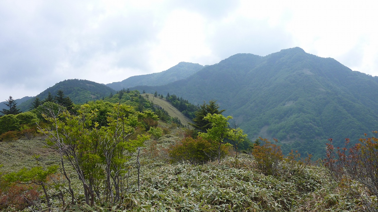 最初のピークを登りきると、目指す矢筈山が望めます。中央奥の山。