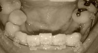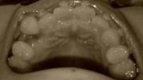 やっぱり下顎は動きが鈍いものなんでしょうか?右下の犬歯の動きが鈍いため、なかなか抜歯痕が狭くなってきません。まだ5ミリはある。(抜いた歯のサイズがデカかった、ということも原因?)コイツです。コイツがもう少し頑張って動いてくれたら左側の3番が内側に入ってくれるんじゃないかと思うんですが。今は3番が外側に押し出されてて、アーチがひどく歪んじゃってます。まぁもともと歪んでたんですけど、まったく改善の兆しがないなぁ。上下の歯を噛み合わせた状態(といっても、左の2番同士しか当たってませんが(^-^;))を、下から撮影してみました。うわぁ…_| ̄|○ こりゃ噛めないわ。途中経過とはいえ、ツラいなぁ。次回調整日まで、あと1週間。