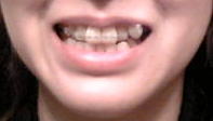 矯正装置を付け始めてからちょうど10ヶ月になります。動き自体はまぁまぁみたいなんですが、やっぱりイヤなことって多いですよね。何と言っても一番イヤなのは、顔が変わってしまったこと!!!元の顔、そんなに嫌いじゃなかったので、今の顔がすごくイヤでイヤでしょうがありません。どう変わったかというと、まず出っ歯になったこと。それが原因(上顎が前に出たこと)で、顔の肉が引っ張られて、頬がこけてしまっています。装置付けた頃は、こんな口元でした。今はこんな感じ。前歯がガッっと出てきてるの、わかります?上唇のツッパリ具合でわかると思います。普通にしてたら、ブラケットの上に唇が載ってます。それから、噛みあわせが悪くて口が閉じれない→顔が長く見える、ということ。どのくらい噛み合ってないかというと。めいっぱい深く噛んでも(左が1箇所噛めてるというか当たってる)、右側は隙間から舌を出せるぐらい隙間が空いてます。なので、唇を閉じても隙間が空いて装置が見えます。唇がうまく閉じれてないので、最近お茶を飲む時に横から漏れる時があって鬱。他の方の矯正ブログなどを拝読してると、みるみるよくなっていってる方が羨ましいです。正直、途中でこんなヒドい顔になっちゃうとは思ってなかったヨ…_| ̄|○ところで、次の調整日まで1週間ですが、課題。どうも動いてないなぁと思っていたら、またもやフックがズレてきてました_| ̄|○また締めなおしてもらわなきゃ~…。それと、ヘンなところに隙間が!Σ(゚Д゚)左上の1番と2番の間!抜歯痕は右だけで、そこは別に狭くなってないのでズレたわけではない…ということは、上顎拡がった!?もうこれ以上拡がらなくていいよ!!