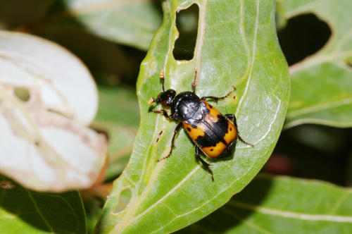 シデムシといえば動物の死体に集まるのでその名がついたらしい。このヨツボシモンシデムシも普段はそうしたところで見つかるのだが、今日は飛んでいました。とまったところは葉っぱの上。これから死体を探しに出かけるところでしょうか?2013.11.05 むろいけ園地にほんブログ村人気ブログランキングへ