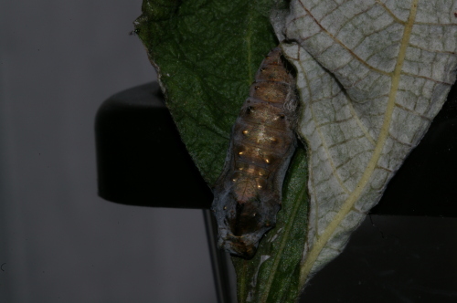 田んぼのあぜ道にカラムシが繁茂している。葉っぱの先が丸く合わさっていたのでもしやと思って拡げてみるといました。アカタテハの蛹です。背中の突起部が怪しく光っています。丸まった葉っぱの中でこんなに光る必要があるのかな?こちらは、先日「虫と遊ぼう」で子供たちに見せたアゲハの幼虫が蛹になったものです。ベランダでキンカンの葉を食べていたのが、行方不明となり今朝、窓枠で見つけました。下手な彫刻家が彫った仏像のように見えませんか?2013.11.12 寝屋川市にほんブログ村人気ブログランキングへ