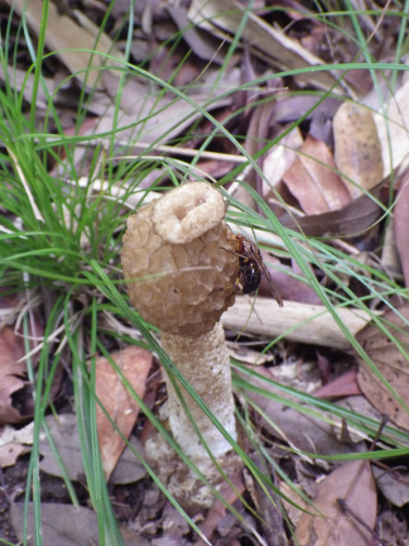 京都梅小路公園は、水族館と芝生広場のイベントで賑わっていました。森の径も人が途切れることがありません。傍らの茂みの中に乾き気味のスッポンタケが見えました。頭のほうは粘液を集まったハエ(とまっているのはベッコウバエのようです)に舐めとられたのかすっかり乾いているようです。 スッポンタケは糞のような臭いを出してハエを寄せ、胞子を運んでもらうそうです。2013.11.17 梅小路公園にほんブログ村人気ブログランキングへ