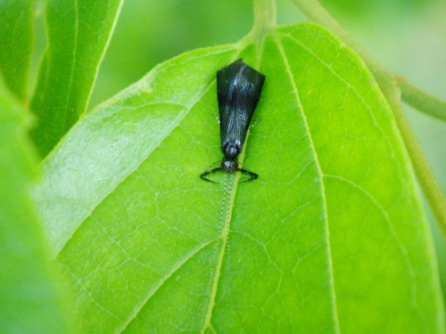 鴨川での親子観察会。川ベリの草の葉にとまっていたヒゲの長い黒い昆虫。水生昆虫トビケラの仲間でアオヒゲナガトビケラでした。実はこのとき草むらをヒゲナガガが飛んでいてオジサンはヒゲナガガの仲間だとみんなに間違えて教えました。みなさんごめんなさい。このまっすぐに長い触角はトビケラの特徴ですよね。幼虫は川の中で砂粒で筒状の巣を作ります。アオヒゲナガトビケラ2014.05.11 鴨川河川敷(北山大橋付近)にほんブログ村人気ブログランキングへ
