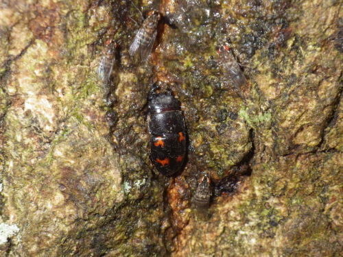 きょうはもう一匹甲虫を紹介する。寝屋川野外活動センターでの整備作業のあと少しだけ自然観察をした。そのときナラ枯れが進行しているコナラの幹にいたのがこの虫です。背中に赤いバットマンマークがあったので昨日紹介したオオキノコムシかと思いましたが、大きな顎があるので別種のようです。図鑑を見るとこれまた普通種のヨツボシケシキスイ、樹液によく集まるそうだ。樹液の季節にはスズメバチが多く、じっと観察なんてできないからよくよく見ることはない。ヨツボシケシキスイ2014.05.26 寝屋川野外活動センターにほんブログ村人気ブログランキングへ