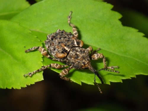 マンションの階段にゾウムシが転がっていた。野外活動センターへ出かけるときだったのでとりあえずプラスチック容器に入れておいた。帰宅してから見てみるといつものゾウムシとかなり違っていた。図鑑を見ると広葉樹林で見られ、アラカシやヌルデに集まる普通種とあった。発生時期5-8月。普通種?でも見るのは初めてでした。マダラアシゾウムシベランダの植木鉢の葉に乗せて撮影。2014.05.26 寝屋川市にほんブログ村人気ブログランキングへ