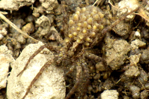 畑の雑草のなかをクモがたくさん走り回っていた。背中の様子が少し変です。何かブツブツがいっぱいついています。小さなクモの子がびっしりと張りついているのです。この様子からコモリグモの名がついたのですね。でもこの仲間はたくさんの種があって私には名前を特定することはできません。2014.05.14 笠岡市にほんブログ村人気ブログランキングへ